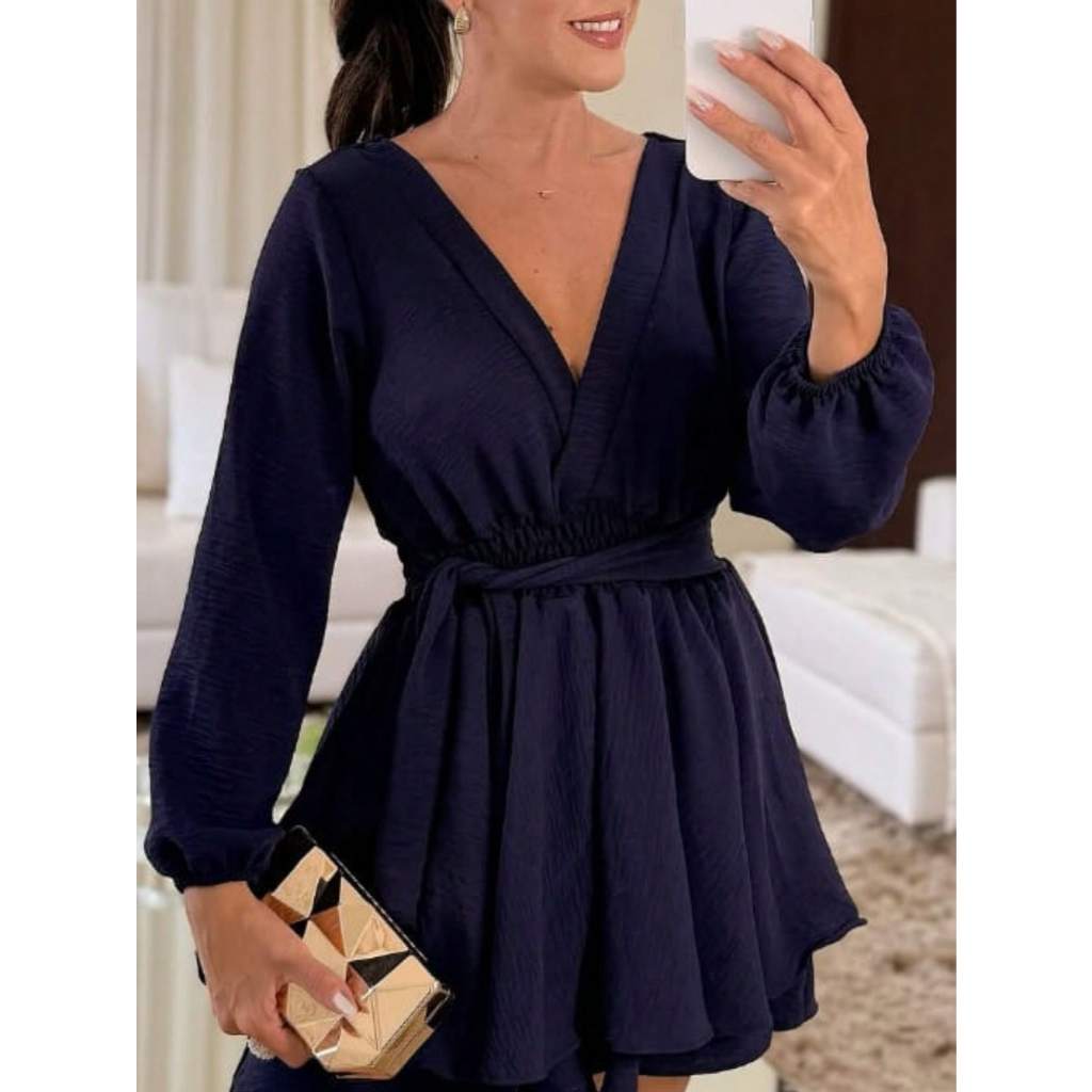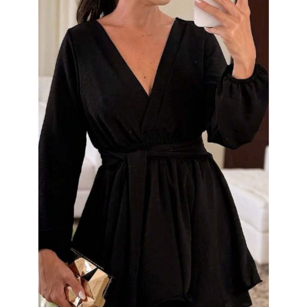 Vestido Macaquinho Com Amarração Frontal Com Elástico Na Manga Simples elegante