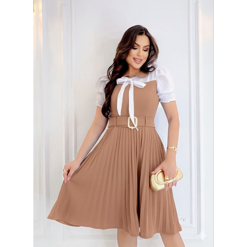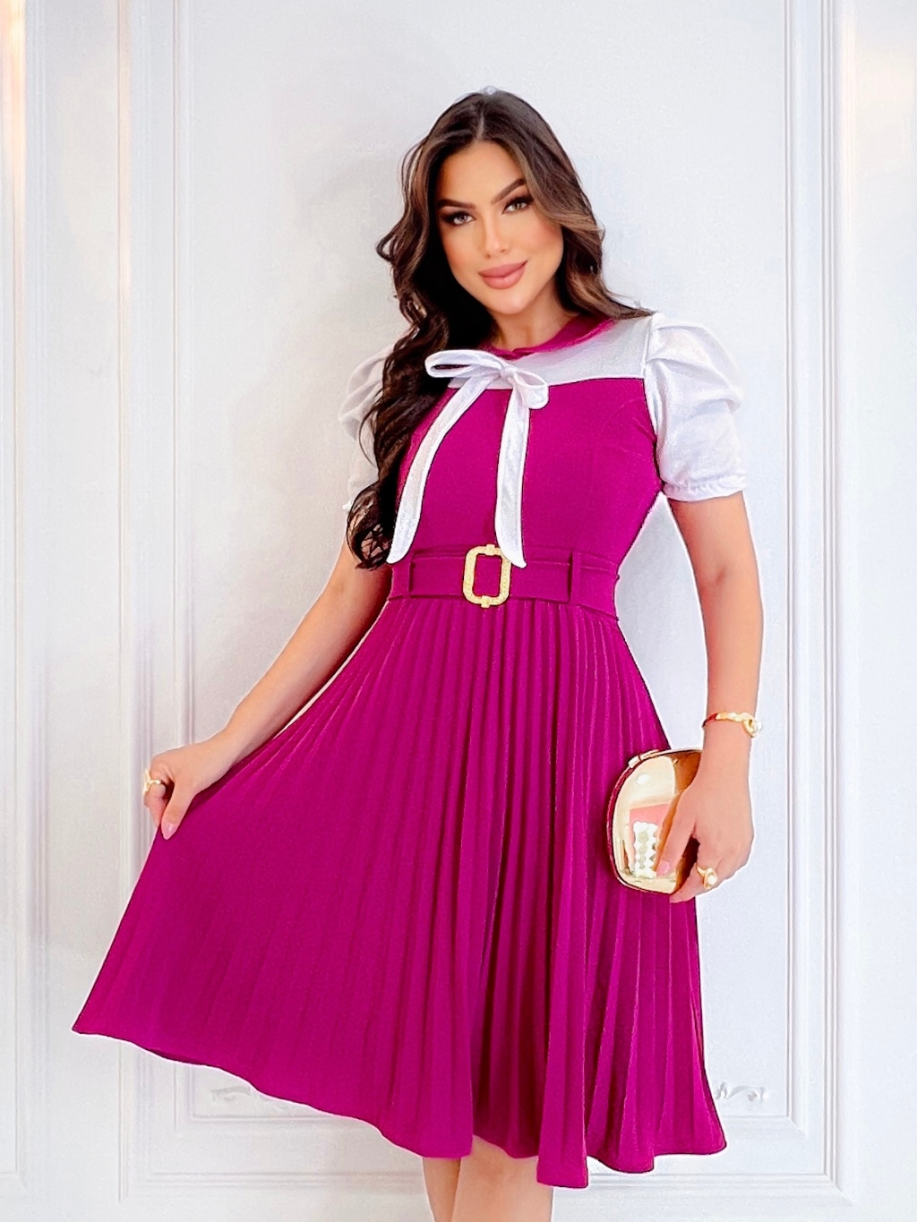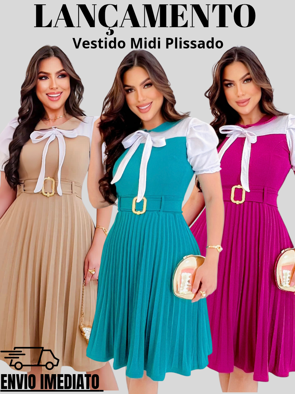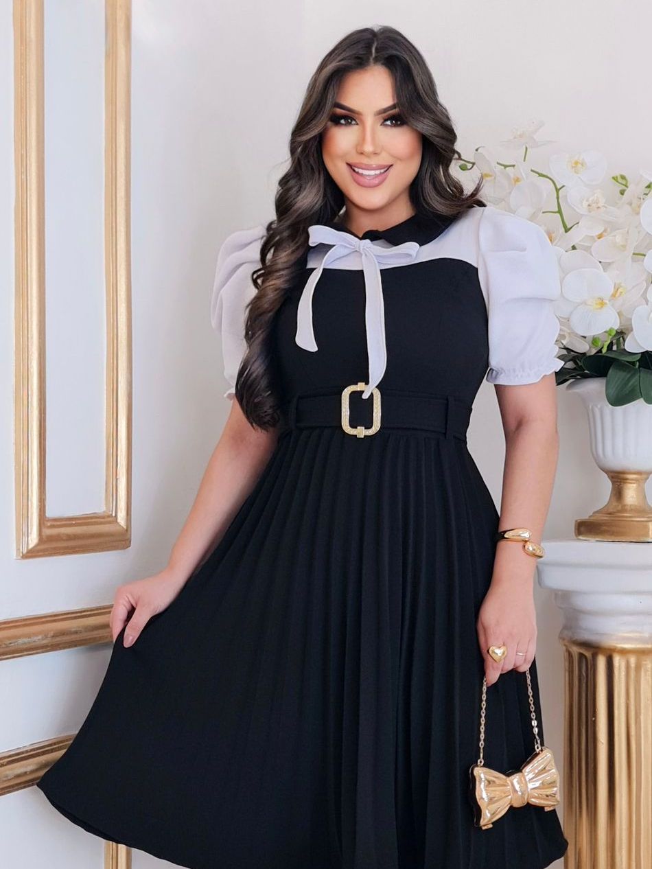 Vestido Midi Feminino Manga Bufante Bicolor Plissado com Cinto Elegante