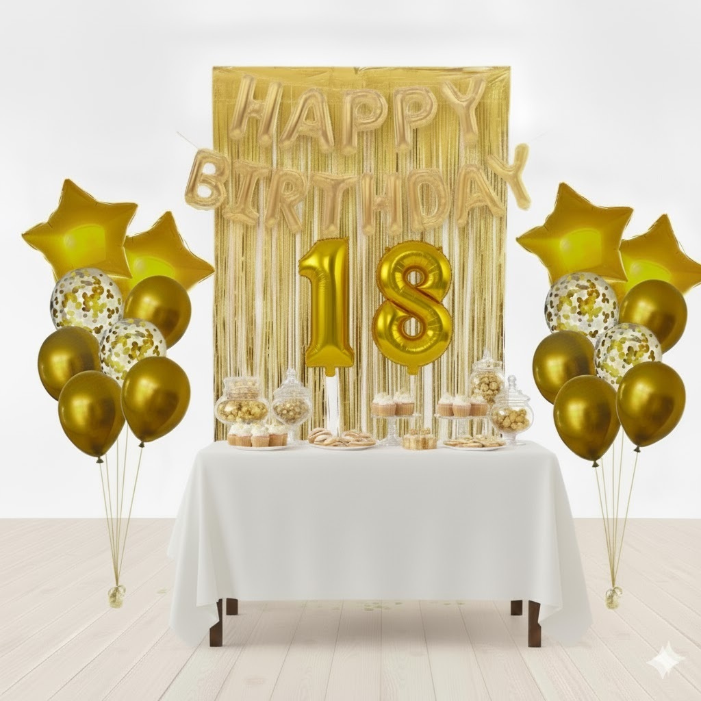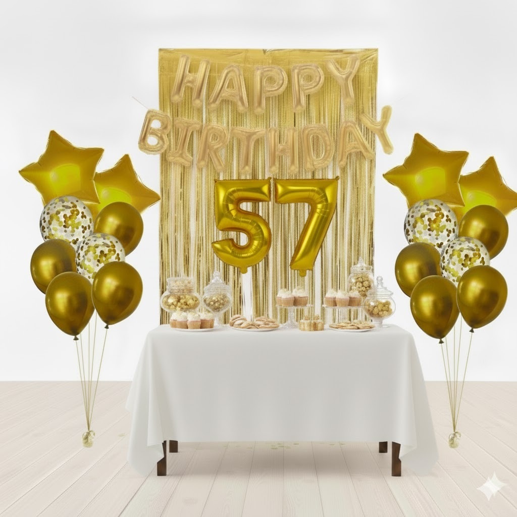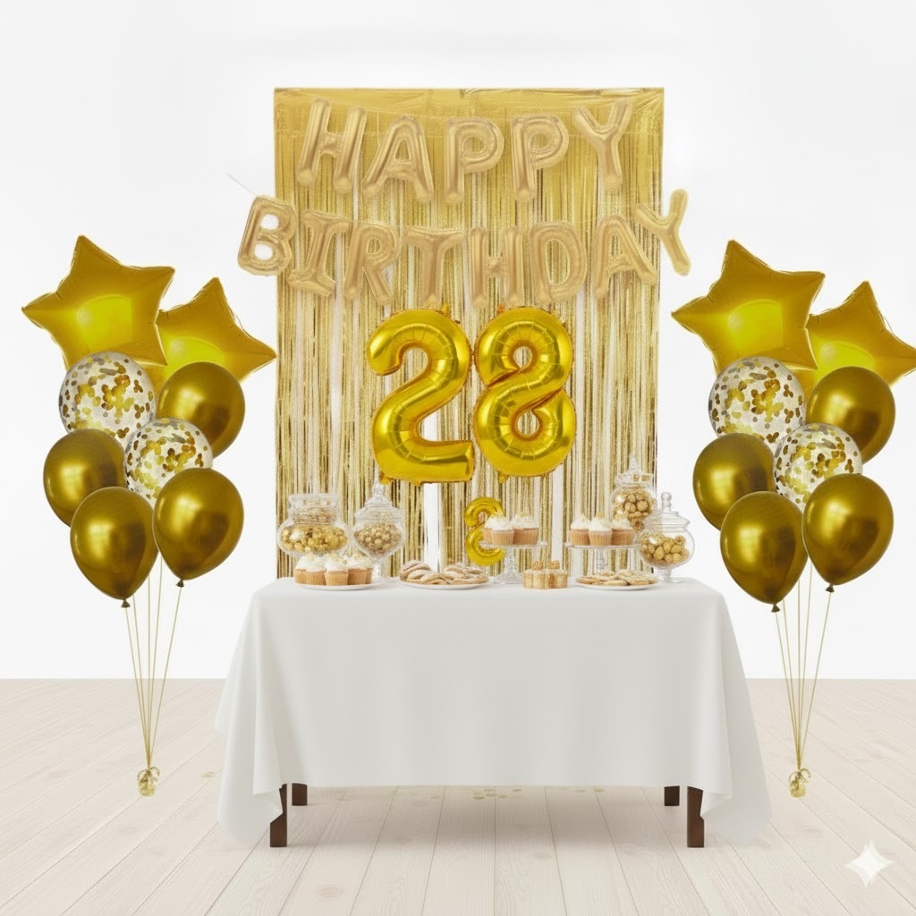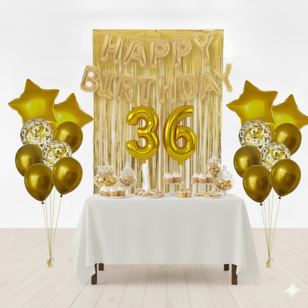Kit Dourado Happy Birthday + 2 Cortinas Dourada + 2 Buquês de Estrela Dourada + 2 Números Dourados