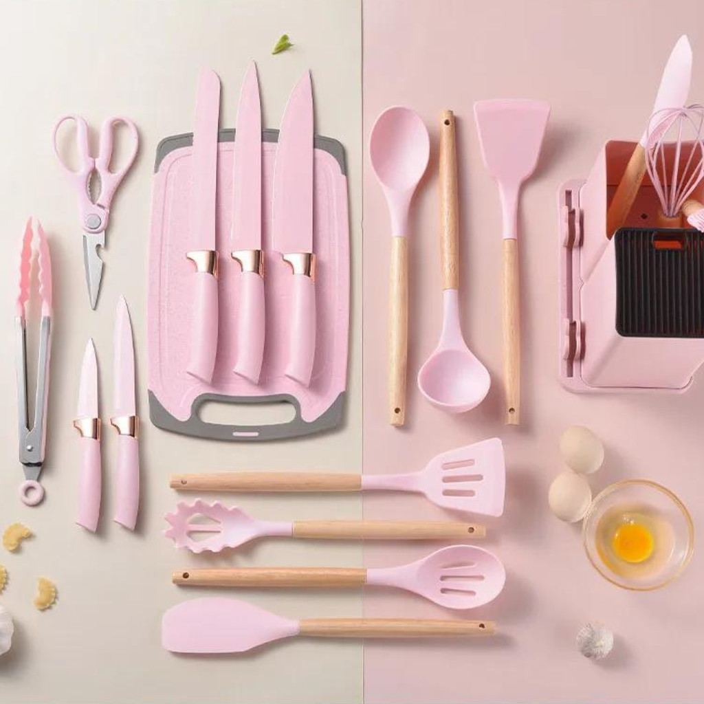 Kit Completo Jogo Utensílios de Cozinha Luxo 19 Peças Com Tábua em Silicone Espátula Faca Tesoura