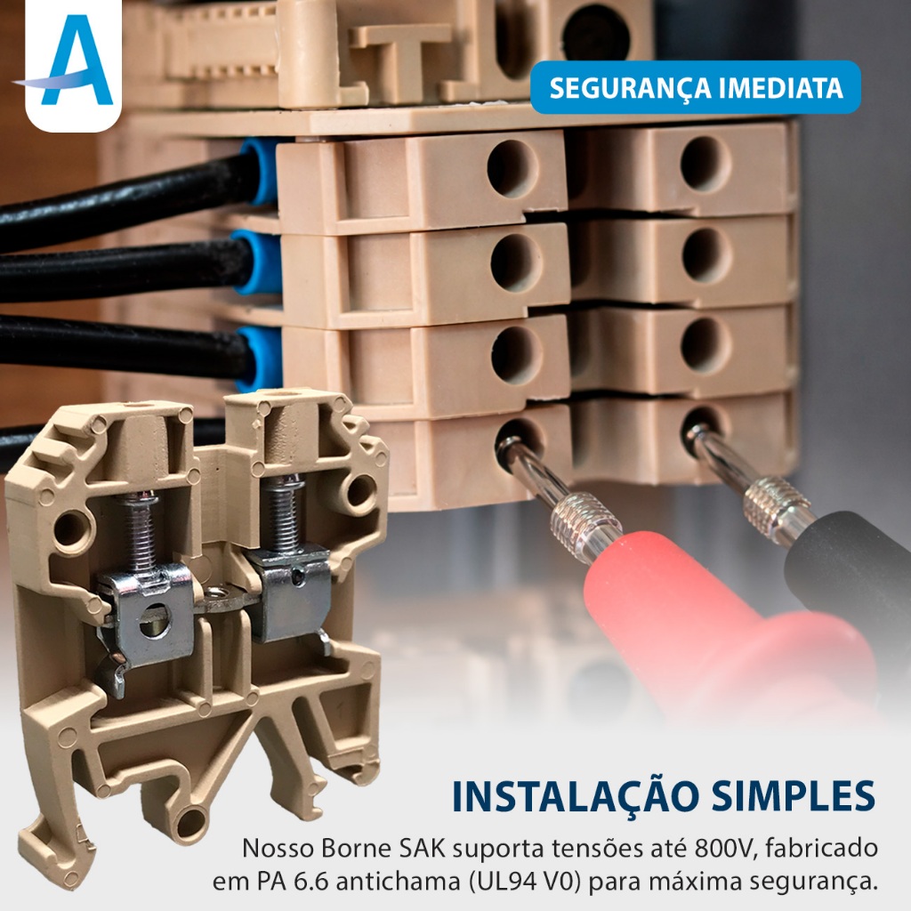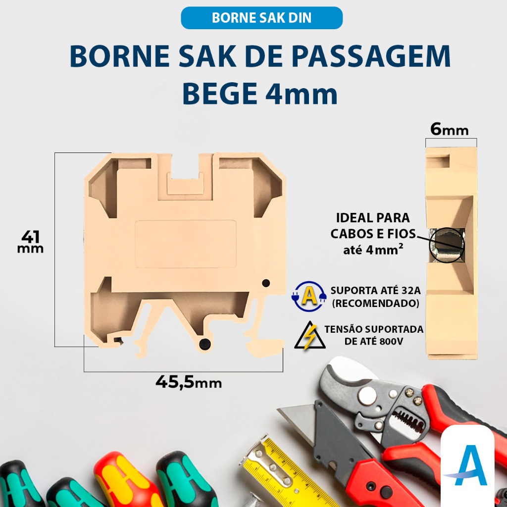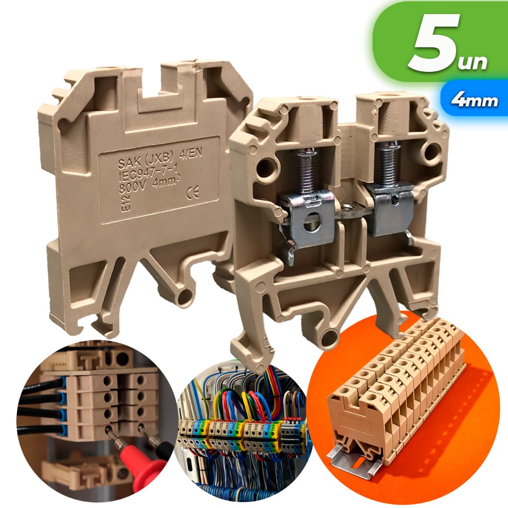 Kit 5un Conector Borne Sak de passagem 4mm Bege Saki Elétrico Fixação Trilho Din Conexão Circuitos