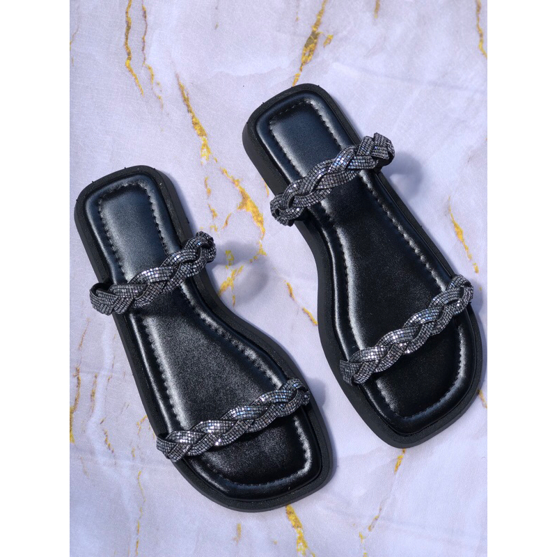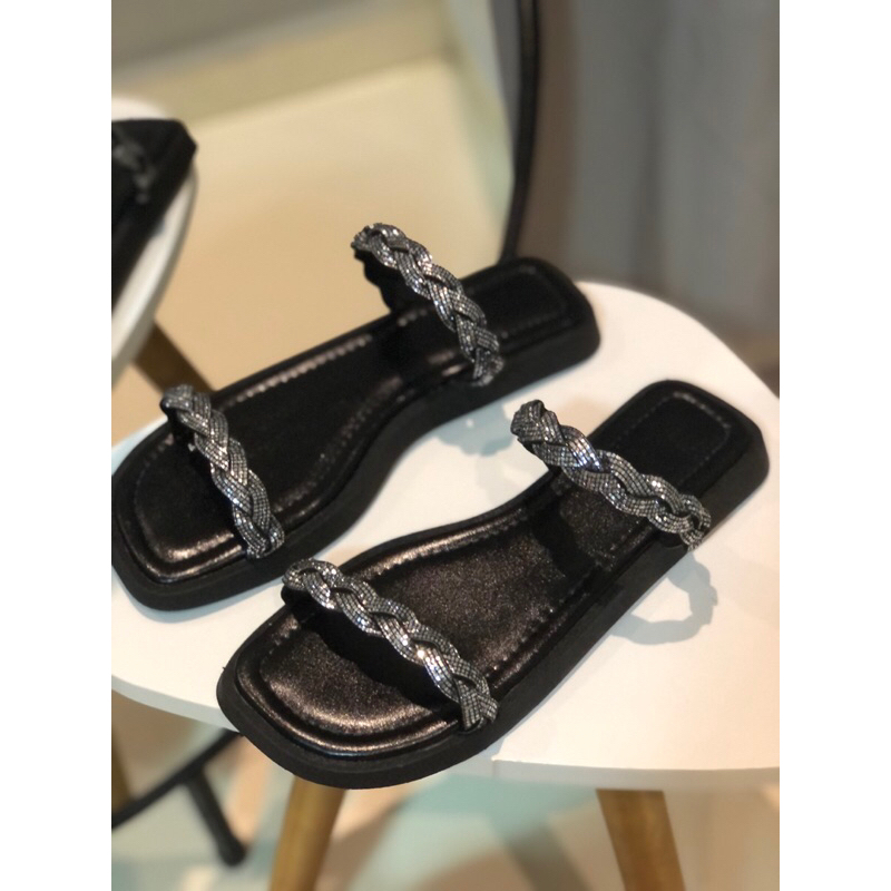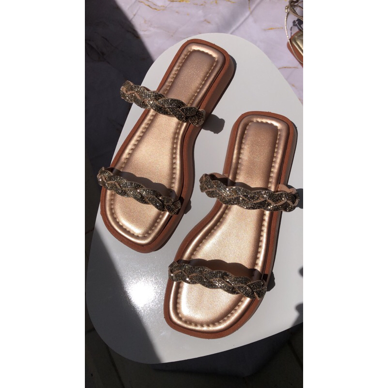 Sandália de Brilho Sola Baixa com Palmilha Confort Rasteirinha Tira trançada de Strass Pedraria 2044