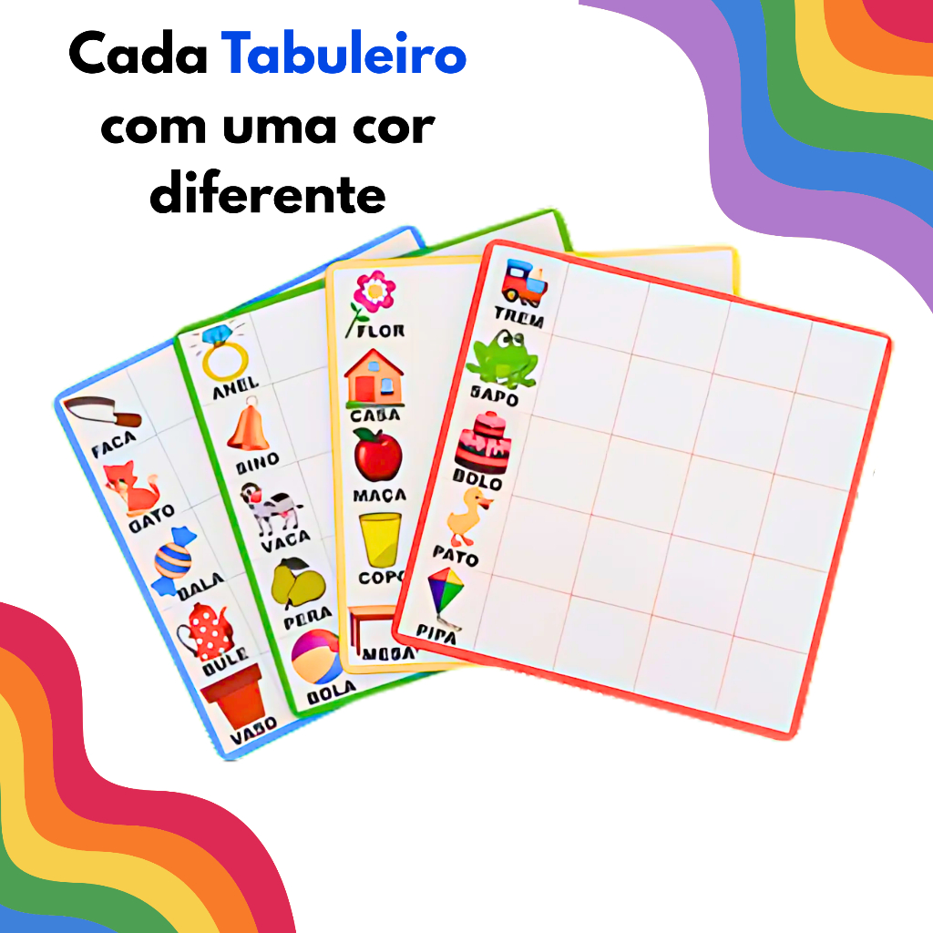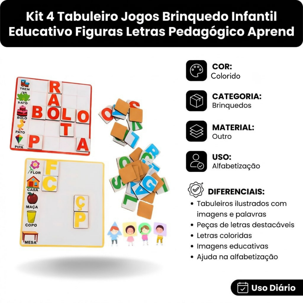 Kit 4 Tabuleiro Jogos Brinquedo Infantil Educativo Figuras Letras Pedagógico Aprendizado