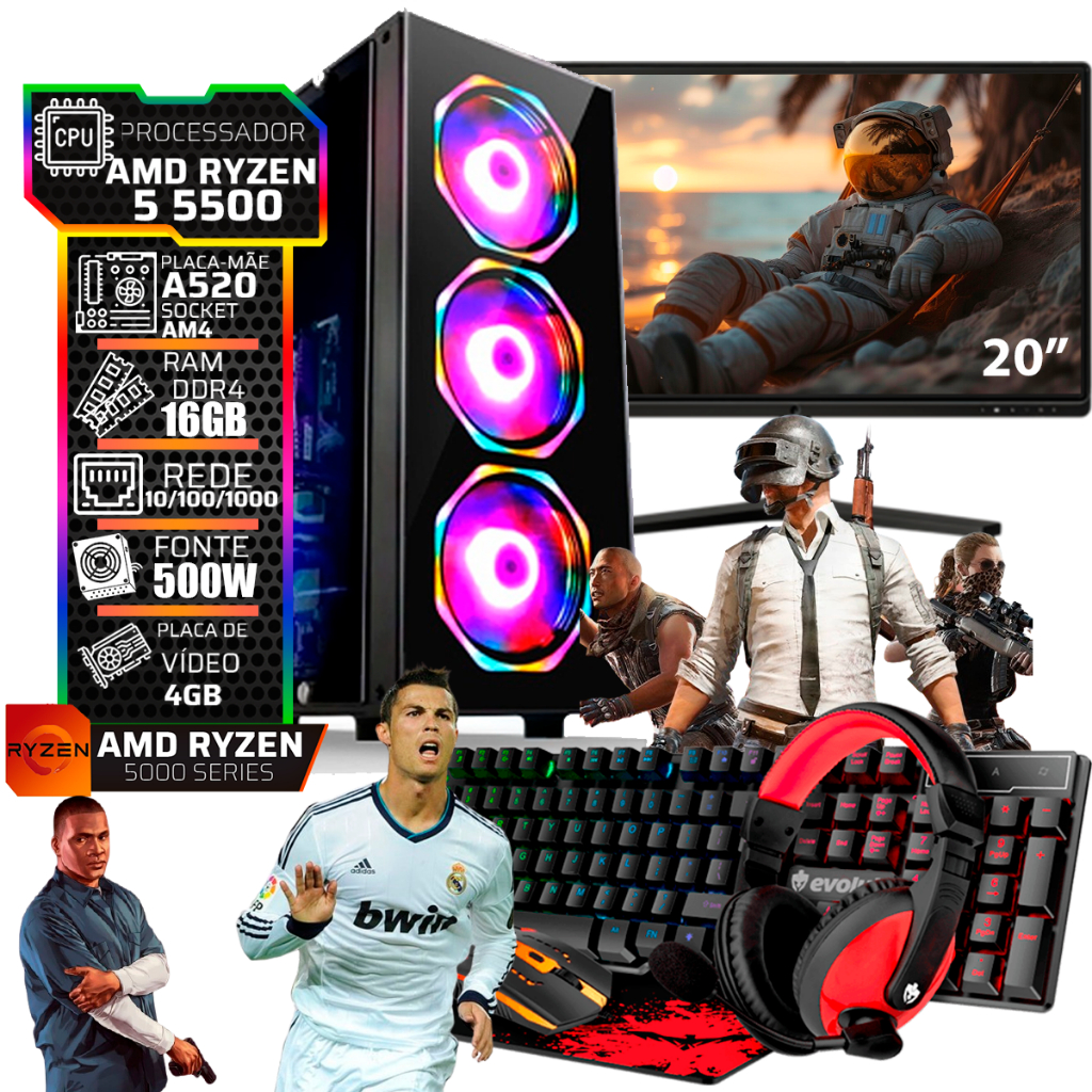 Computador Gamer Ryzen Amd 5 -5500 Ddr4 16gb Ssd 1tb 500w + 4gb Monitor 20''