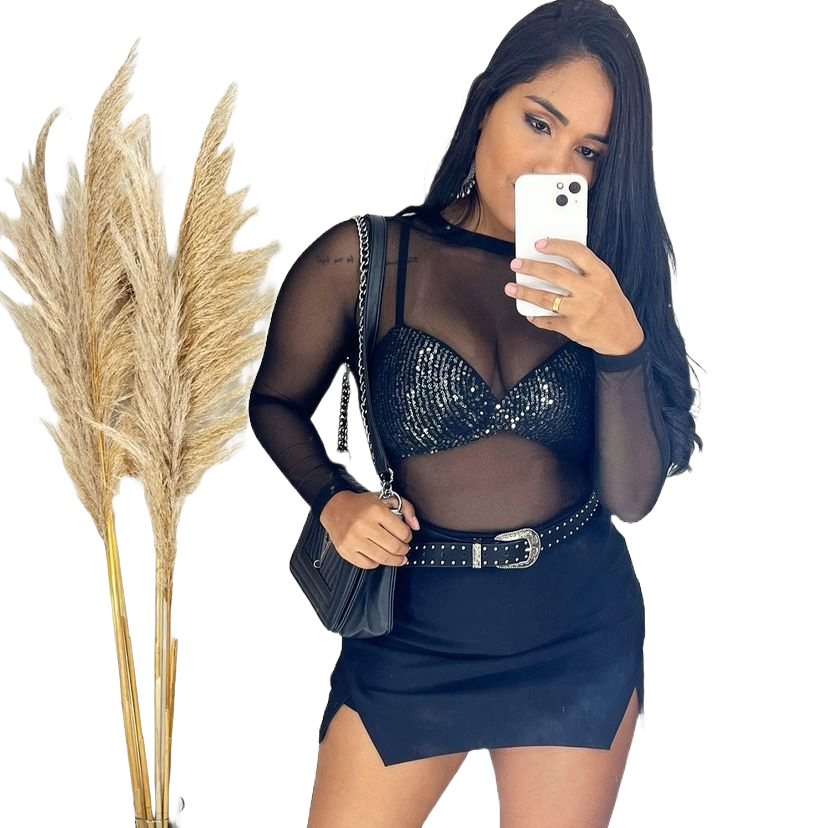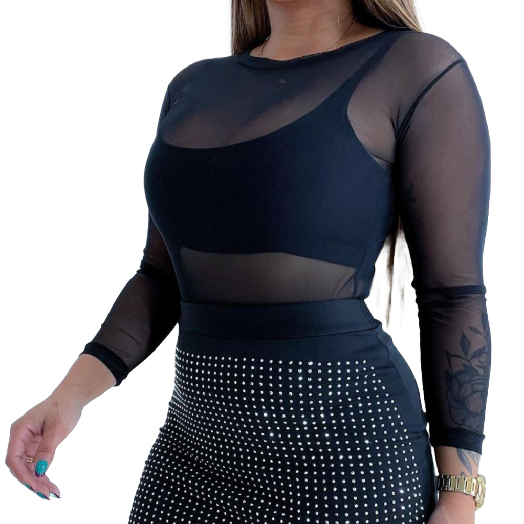 Body Transparente Plus Size De Tule Manga Longa Balada