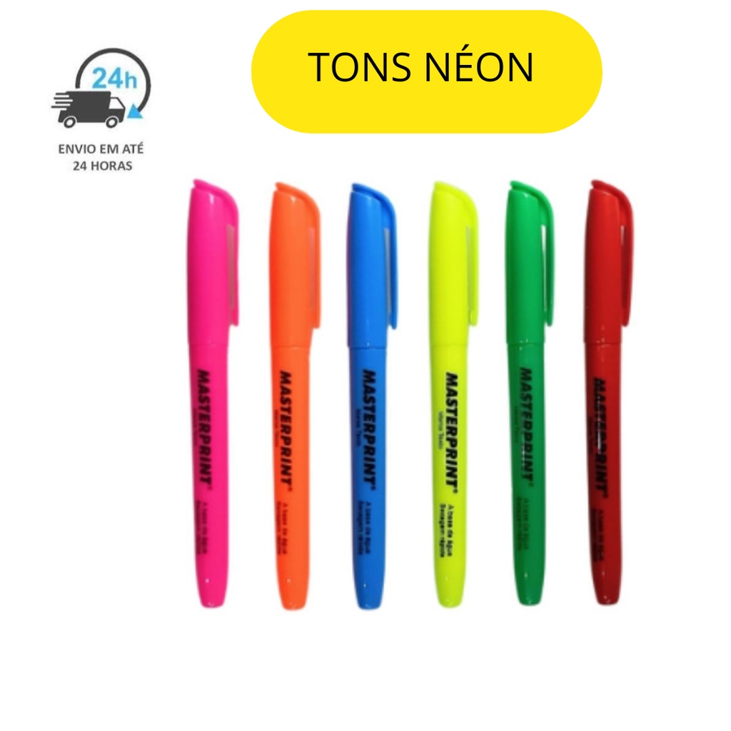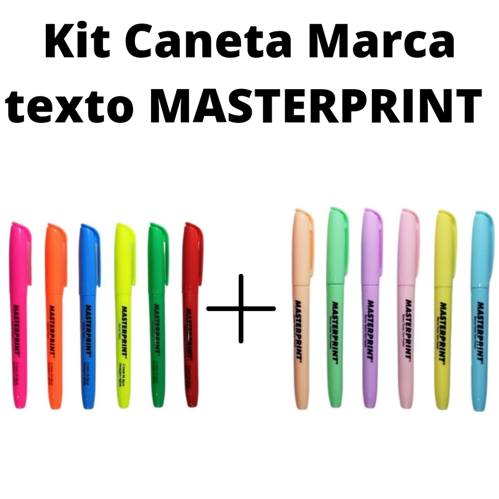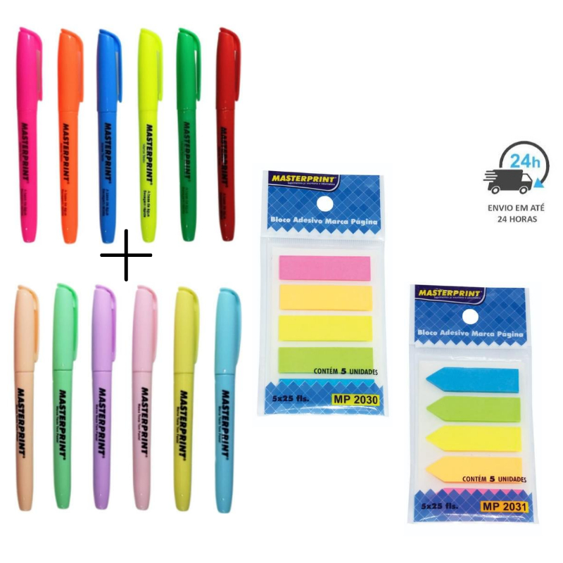 Kit 12 Marca Texto (6 Neon + 6 Pastel) + 2 Bloco Adesivo Seta e Reto MASTERPRINT