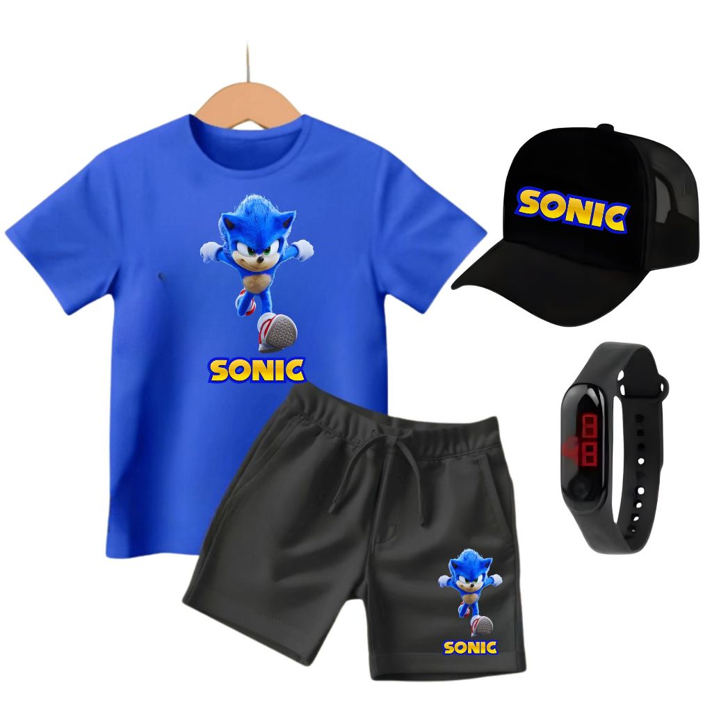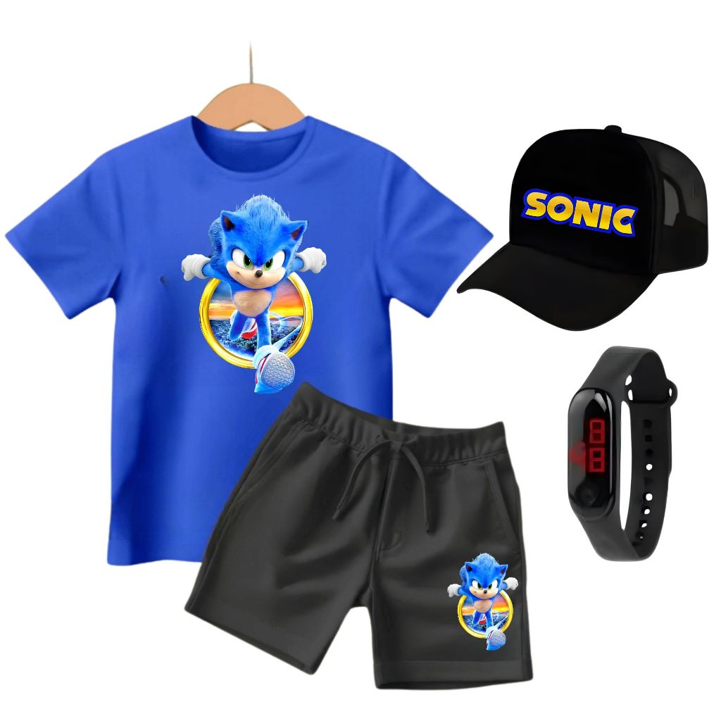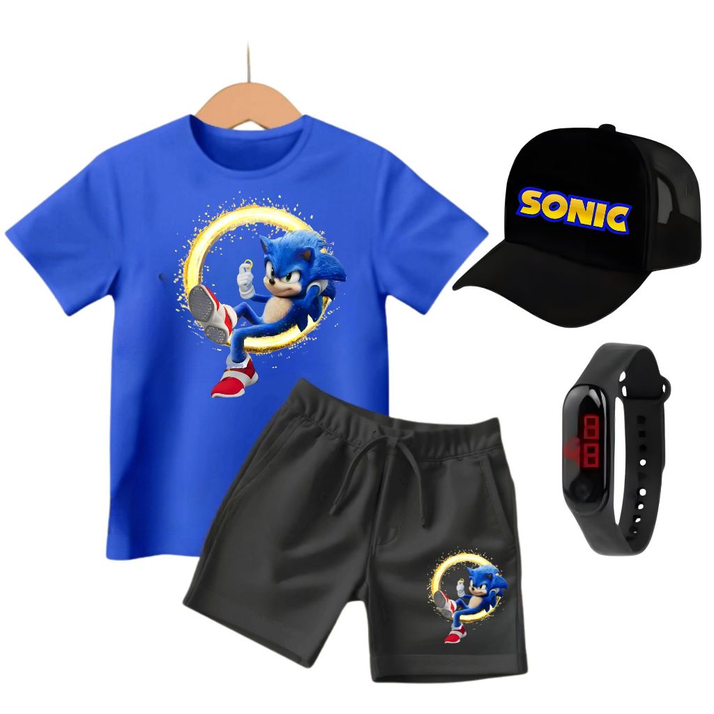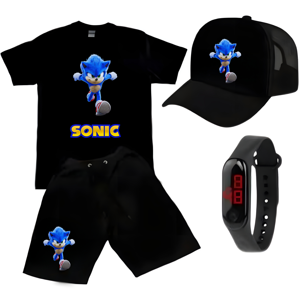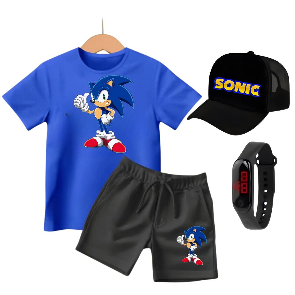 Conjunto Infantil Meninos Camiseta Short Relogio Boné Sonic Camisa Algodão