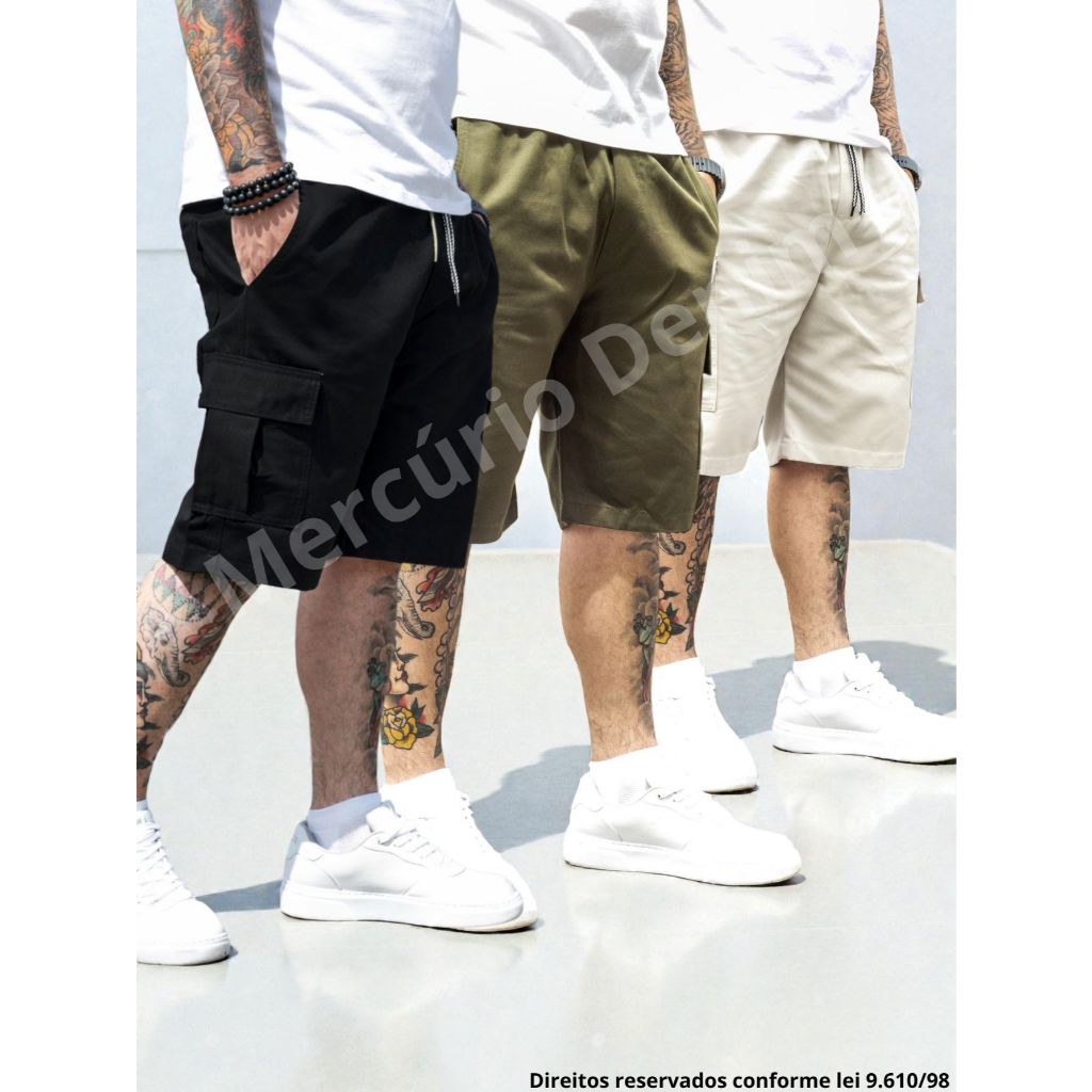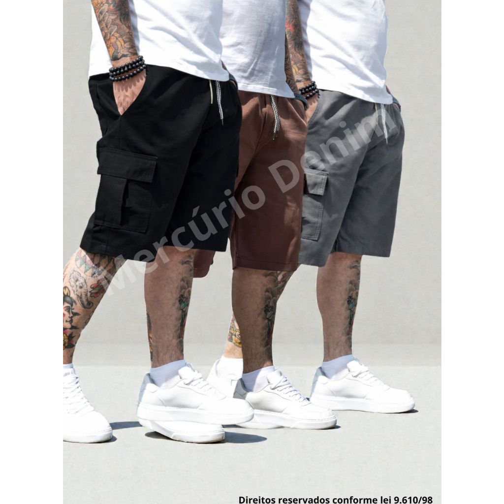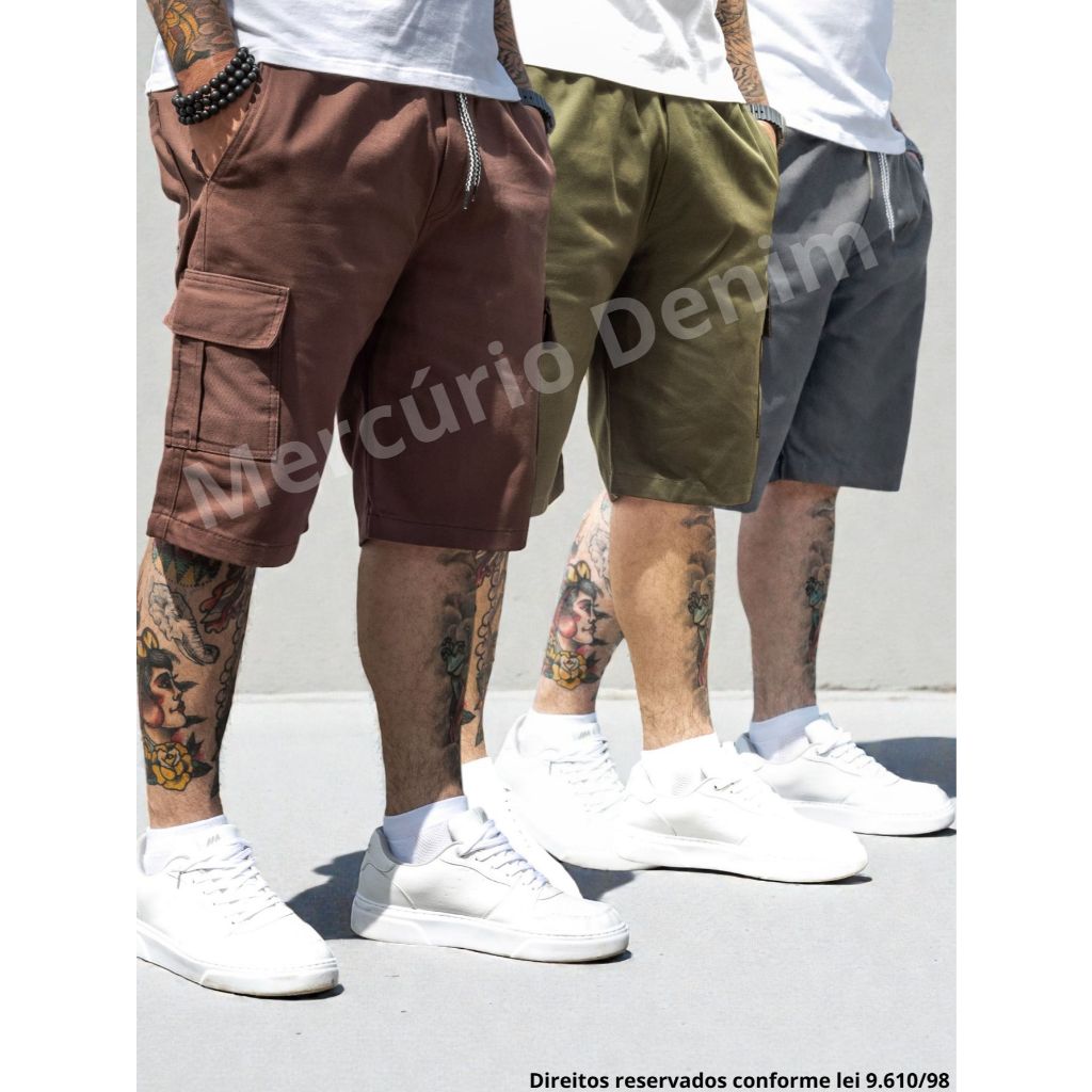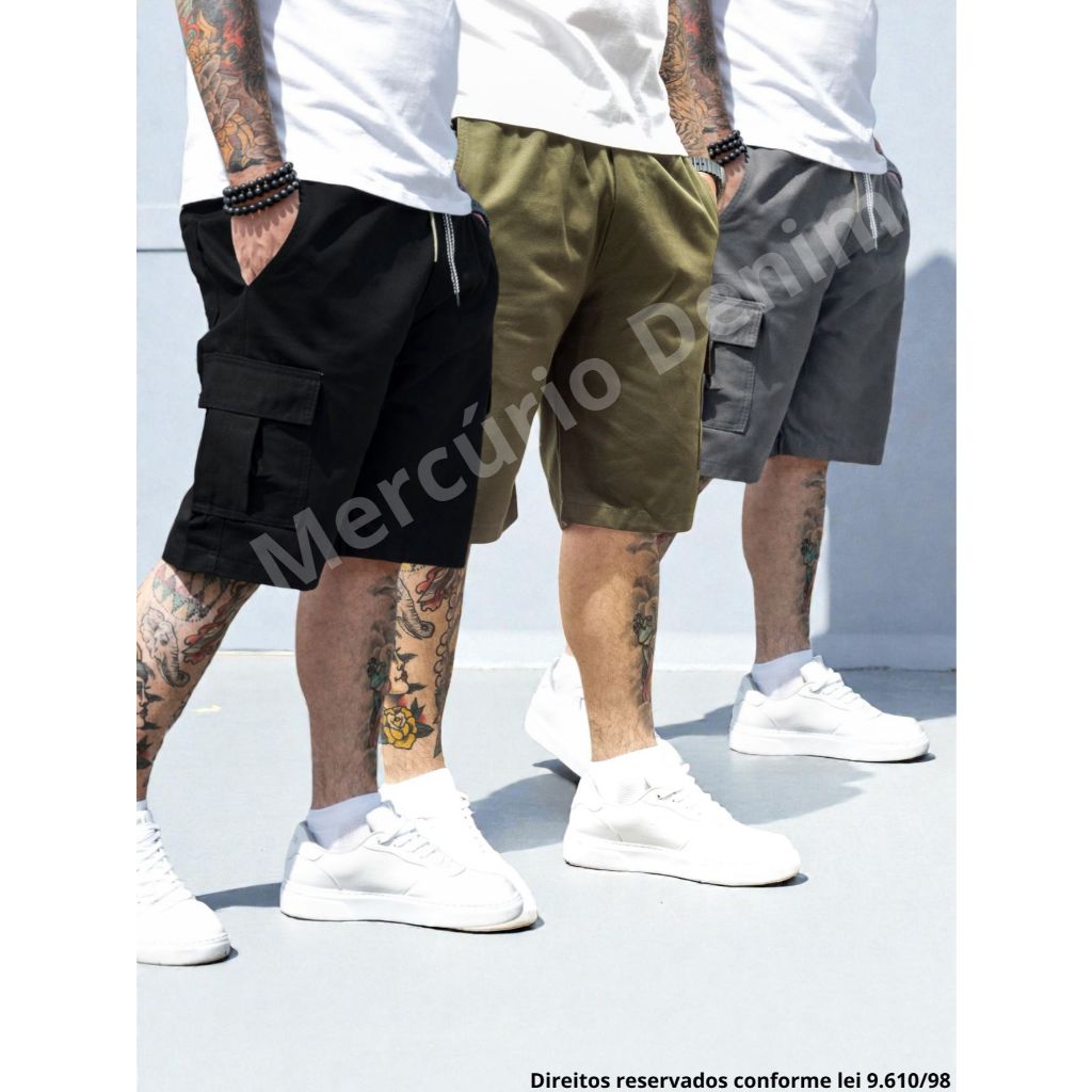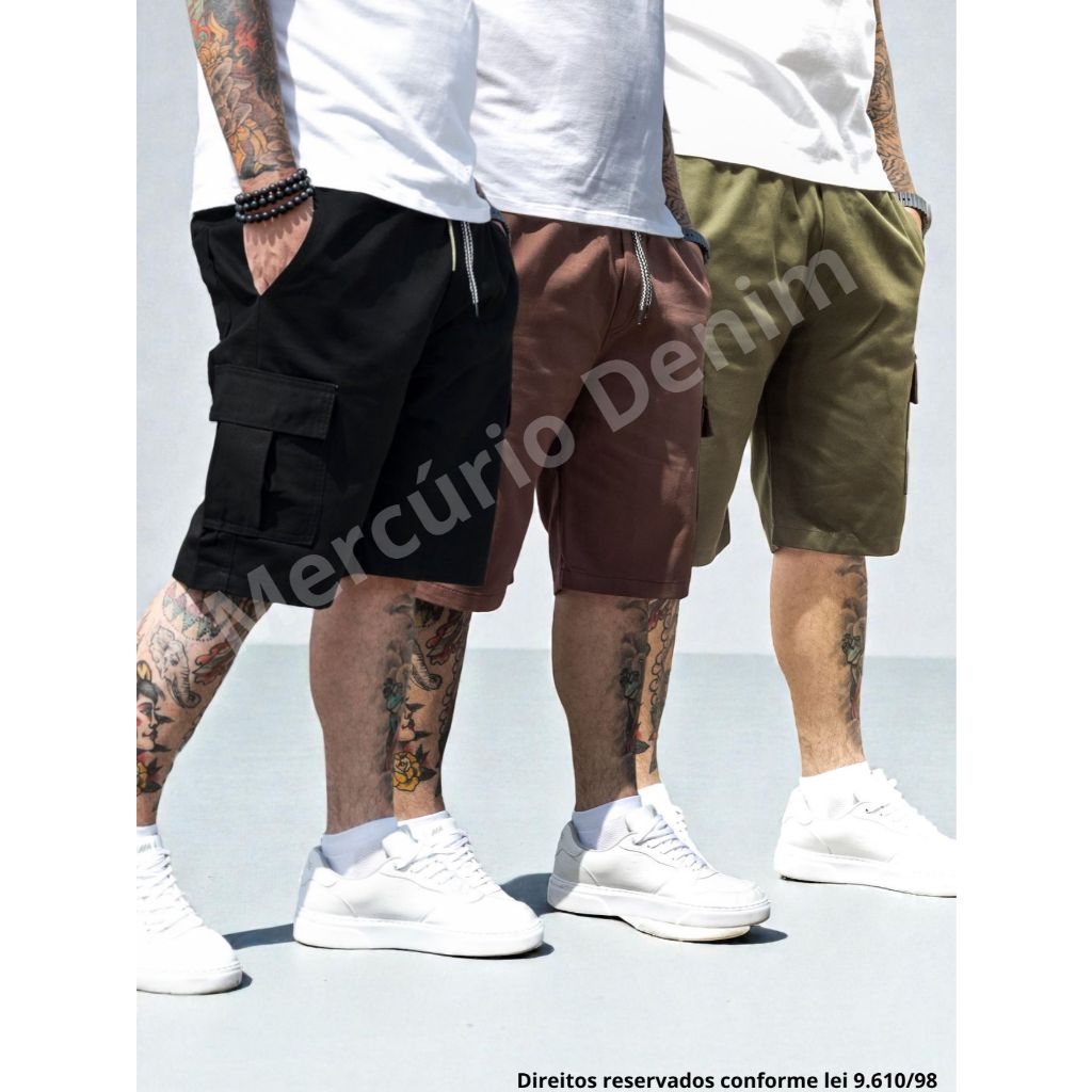 Kit 3 Bermuda Cargo Masculina Sarja Colorida 100% Algodão Utilitária 5 Bolsos