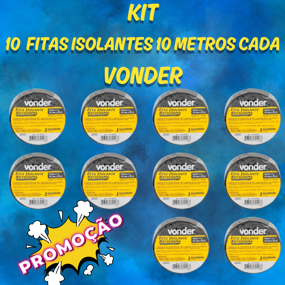 Kit 10 Fita Isolante Vonder 19mm x 10m Preta Antichama - Fita Adesiva PVC Uso Geral Elétrica