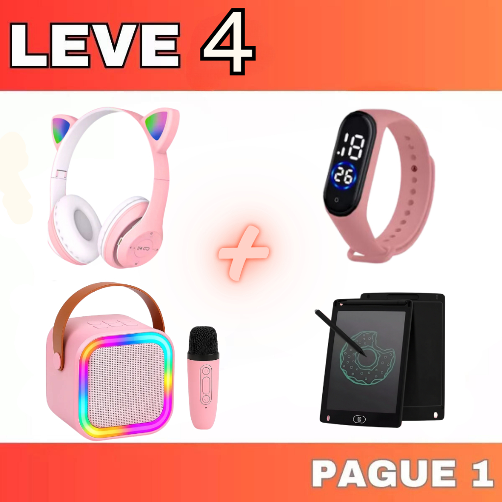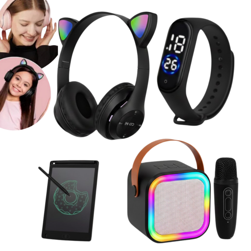 Kit Fone de ouvido Cat Gatinho Infantil + Caixa De Som Karaokê 1 Microfone + Relogio + Lousa Magica