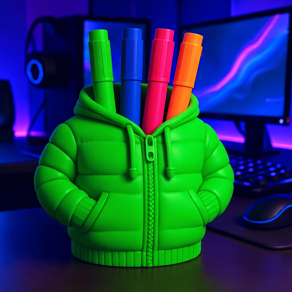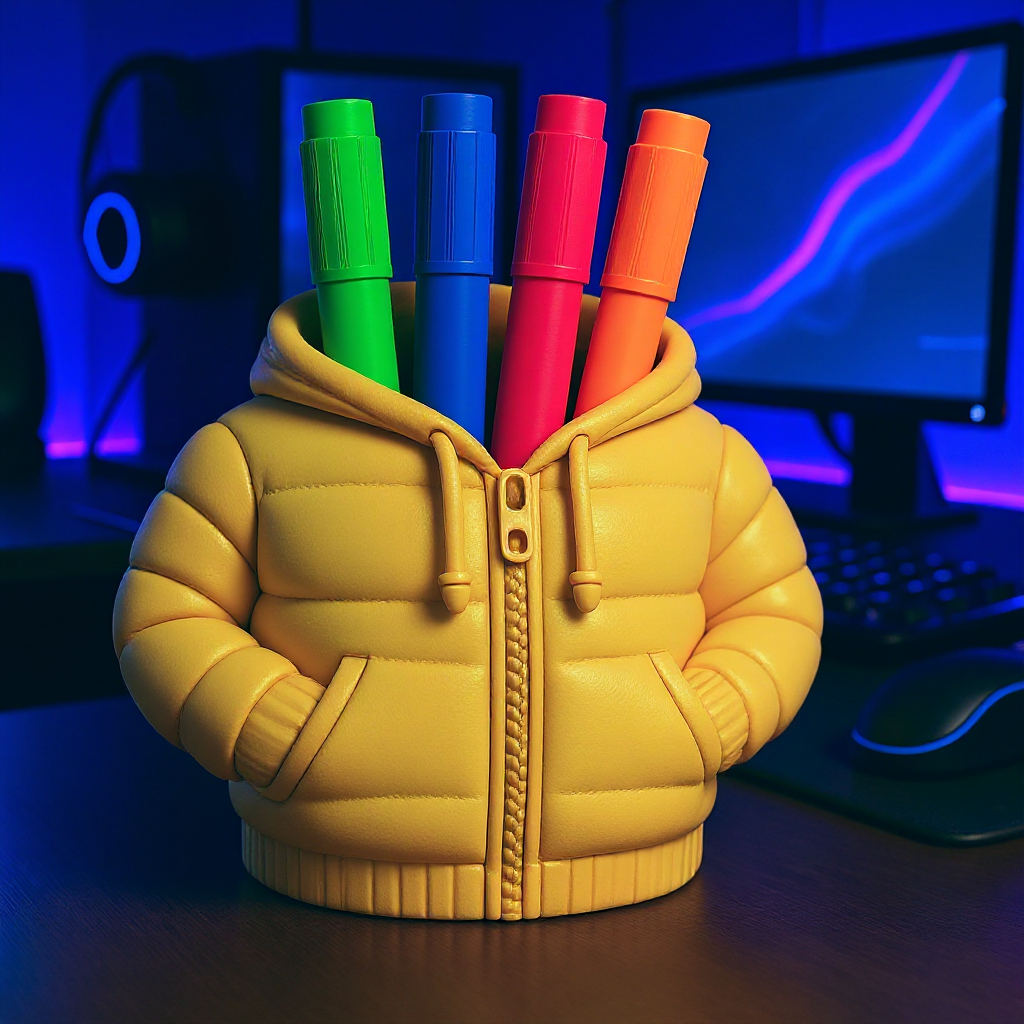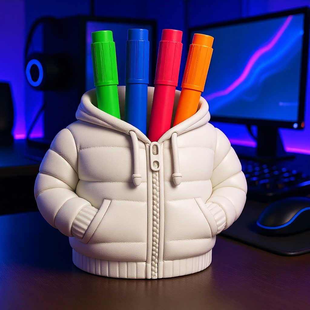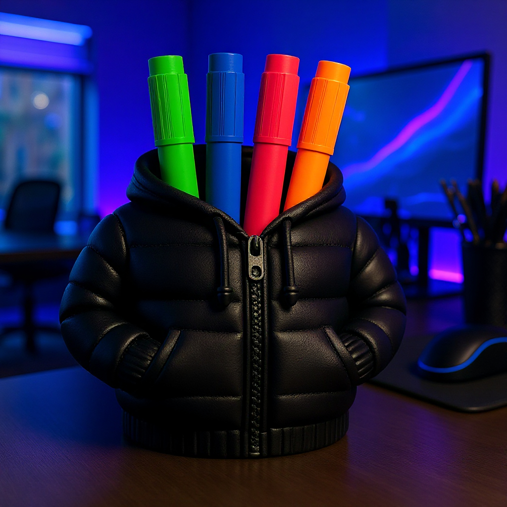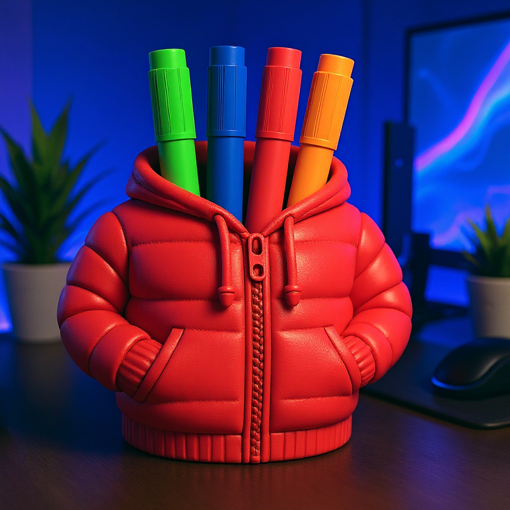 Organizador de Mesa Moderno | Porta Canetas Blusa Puffer Vermelha | Papelaria Criativa