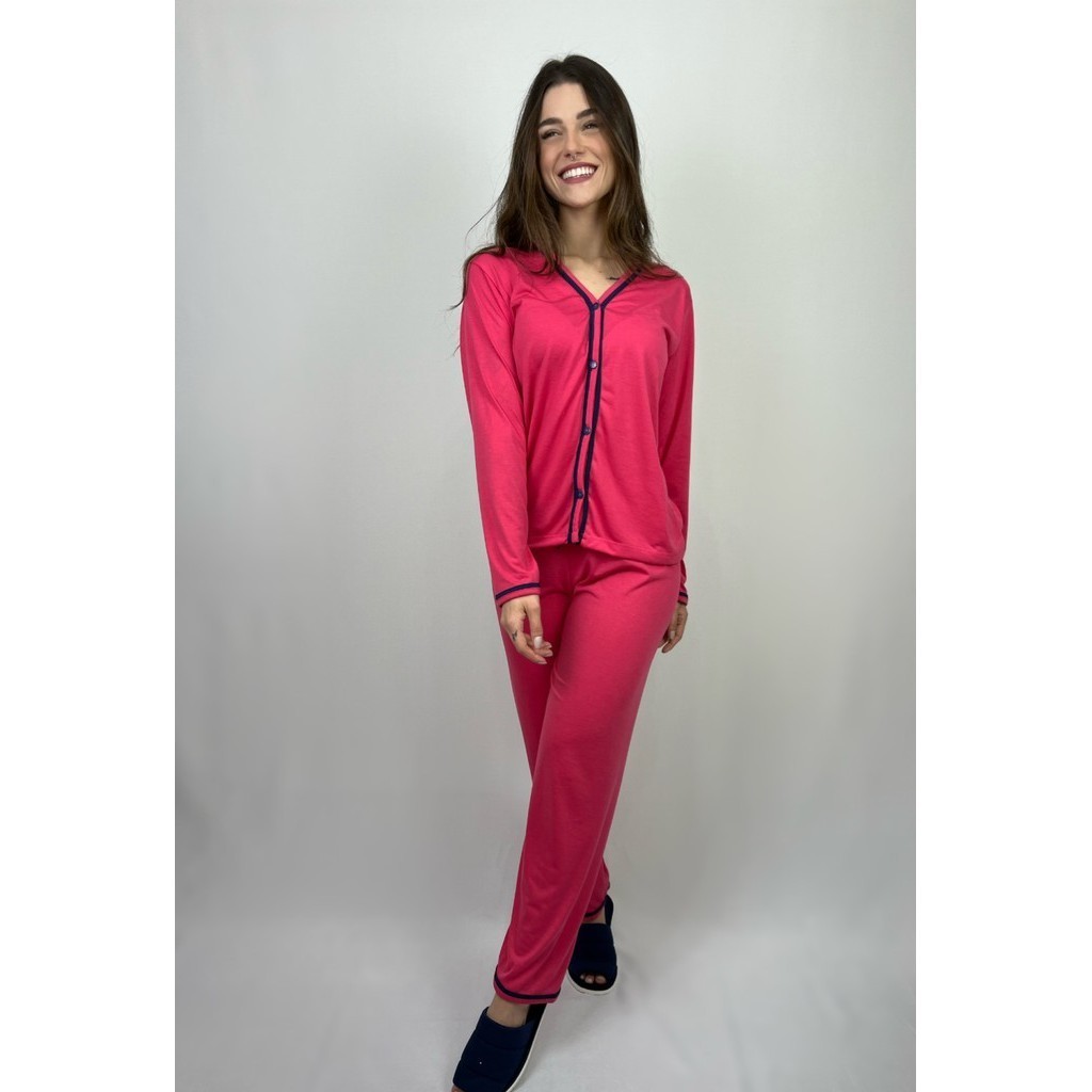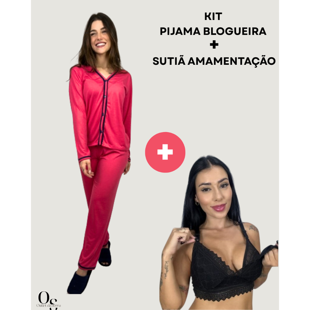 KIT Maternidade Pijama Longo Feminino Americano Amamentação Botões Virginia + Sutiã Amamentação Renda