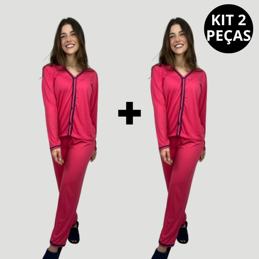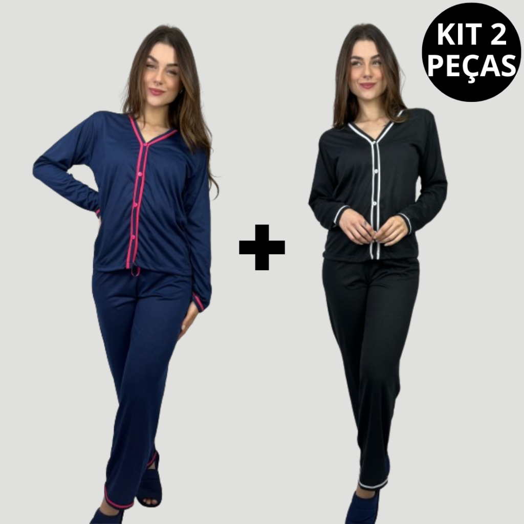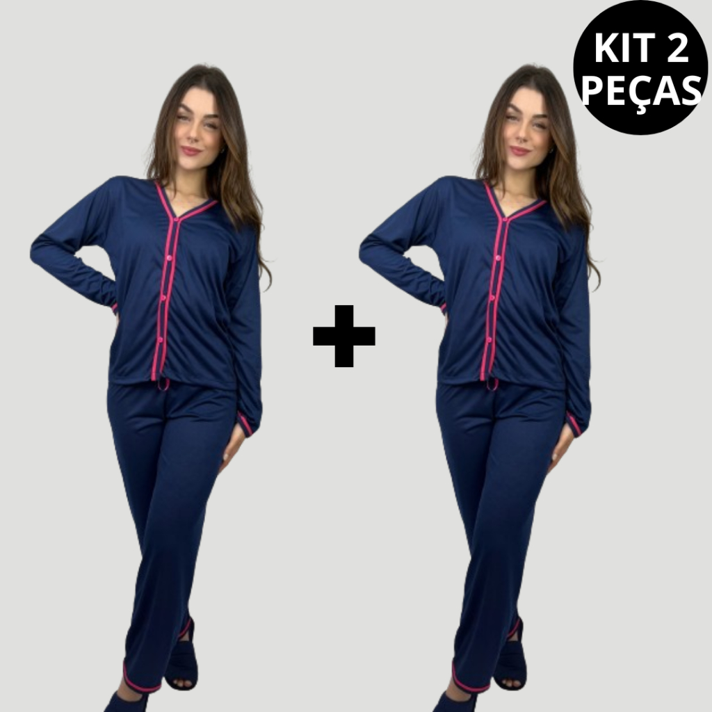 Kit 2 Peças Pijama Longo Inverno Blogueira Malha Botão Amamentação Cirurgico