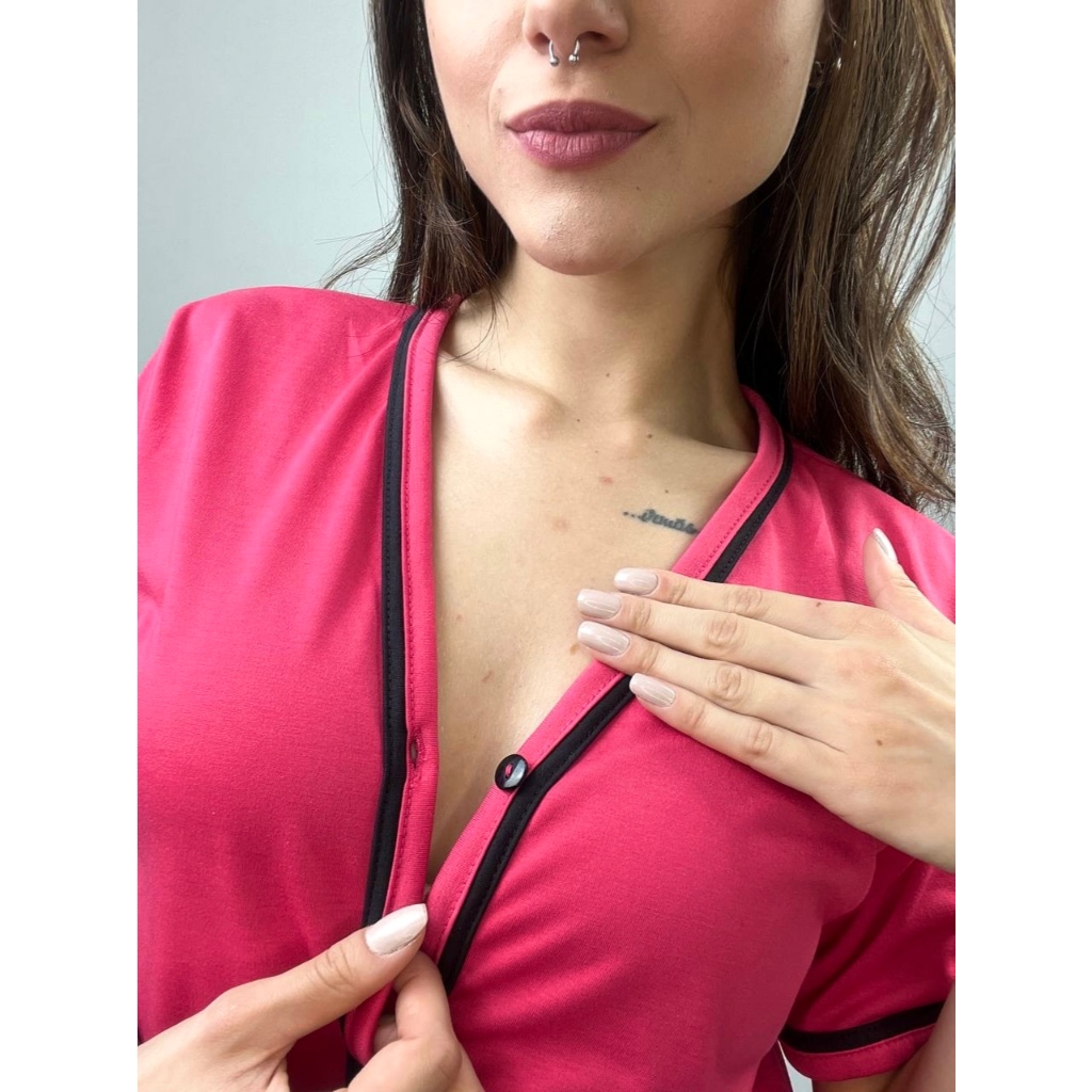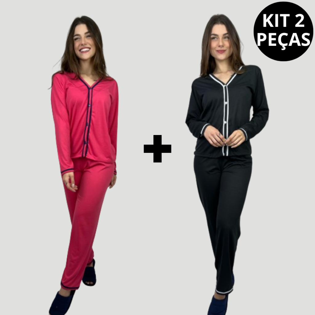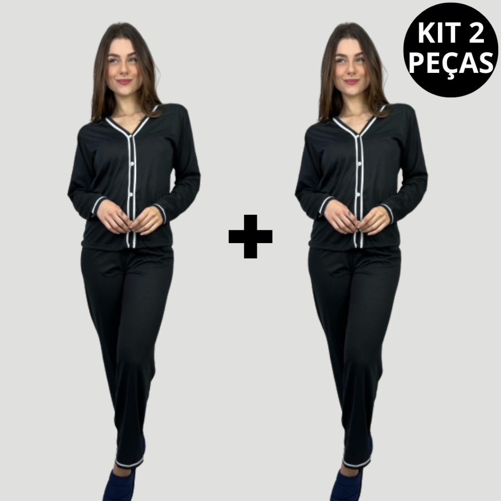 Kit 2 Peças Pijama Longo Inverno Blogueira Malha Botão Amamentação Cirurgico