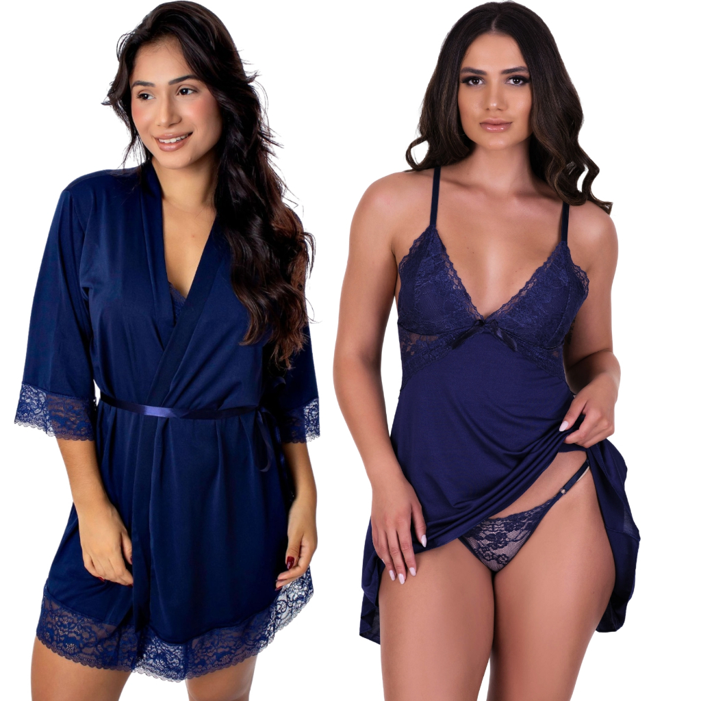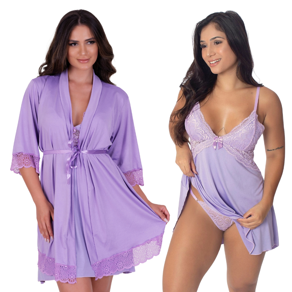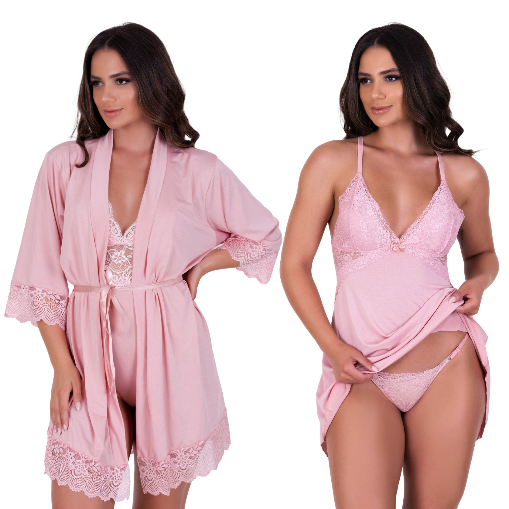 Kit Robe Com Camisola Sensual e Calcinha Luxo Pijama Roupão