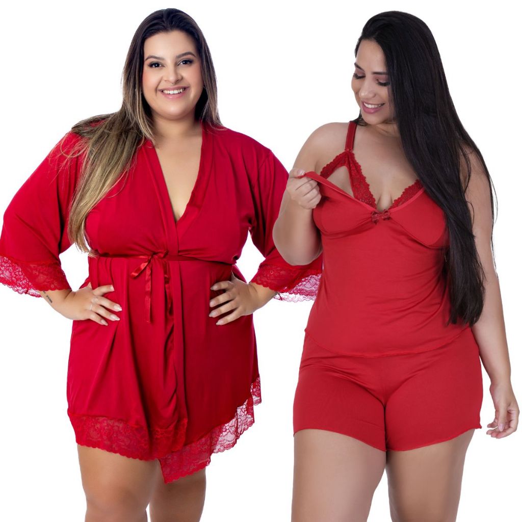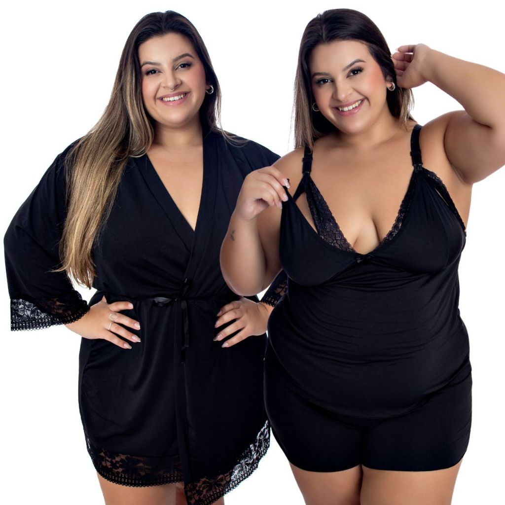 Baby Doll Amamentação Com Robe de Romantic e Renda Plus-Size