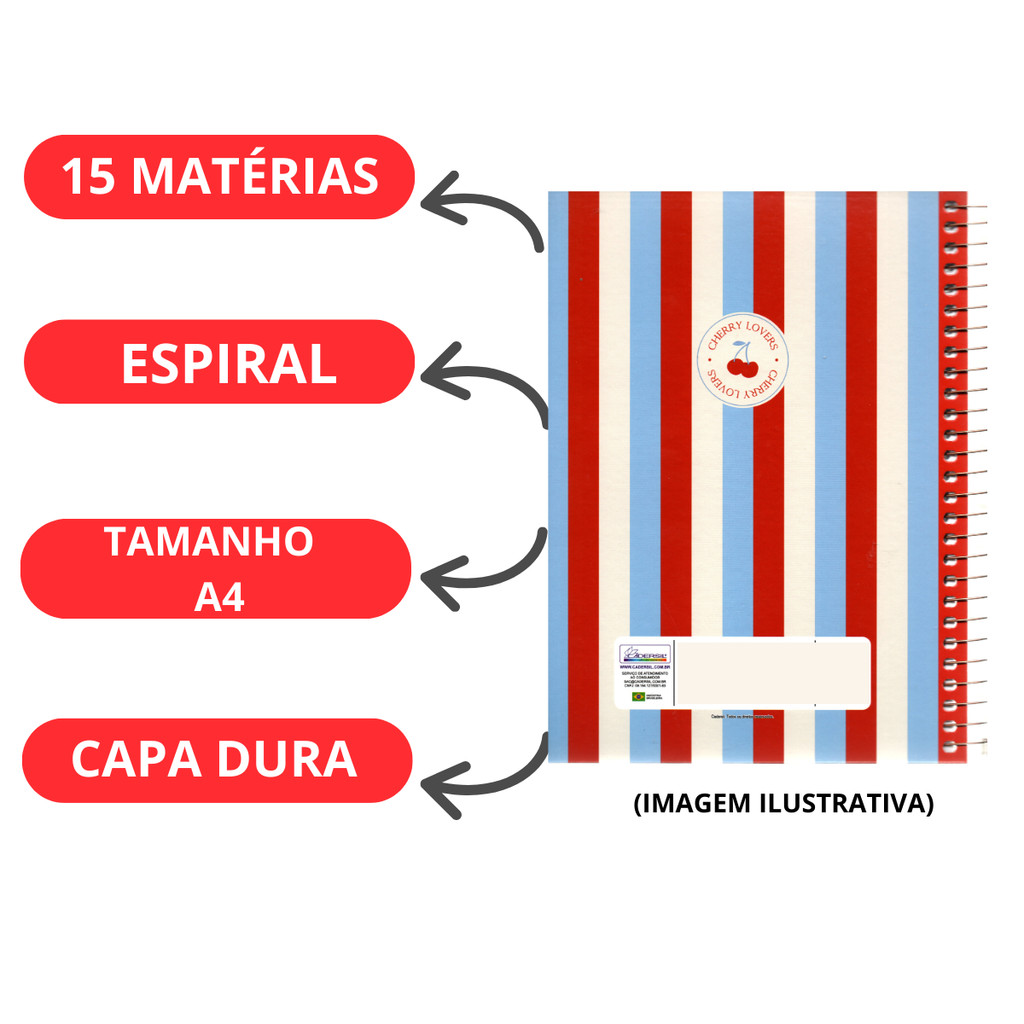 Caderno 15 Matérias Universitário Cherry Lovers 240 Folhas - CADERSIL Capa:Vermelho
