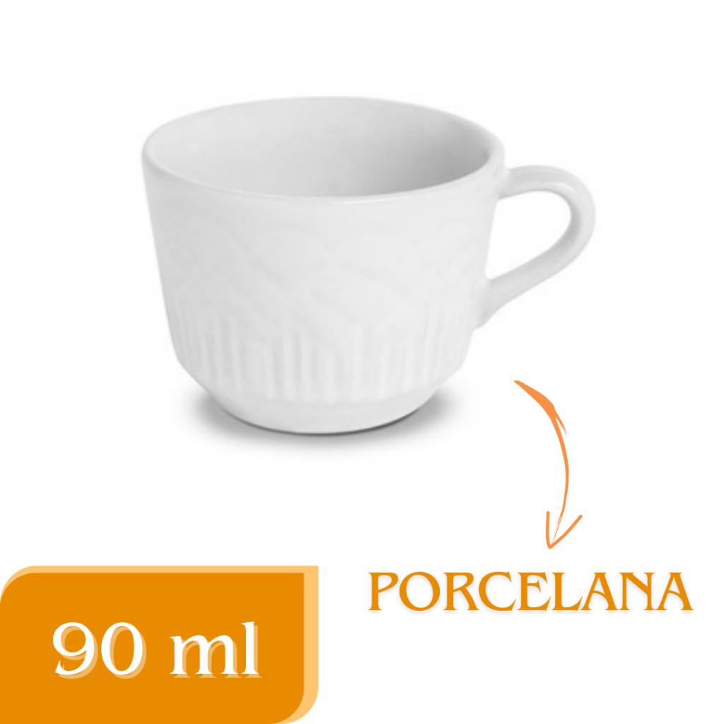 Kit Xicaras Chá Porcelana Relevo Branca e Pratinhos Coração Sobremesa Plástico
