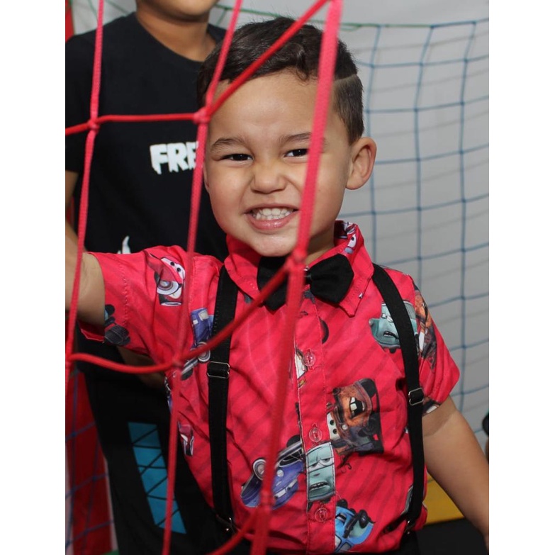 roupa Carros infantil festa menino conjunto Camisa Gravata Bermuda e Suspensório