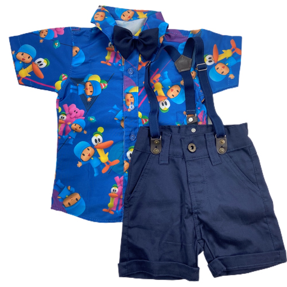 CONJUNTO POCOYO festa menino infantil conjunto Camisa Gravata Bermuda e Suspensório