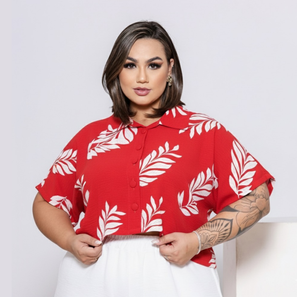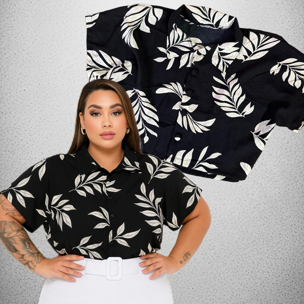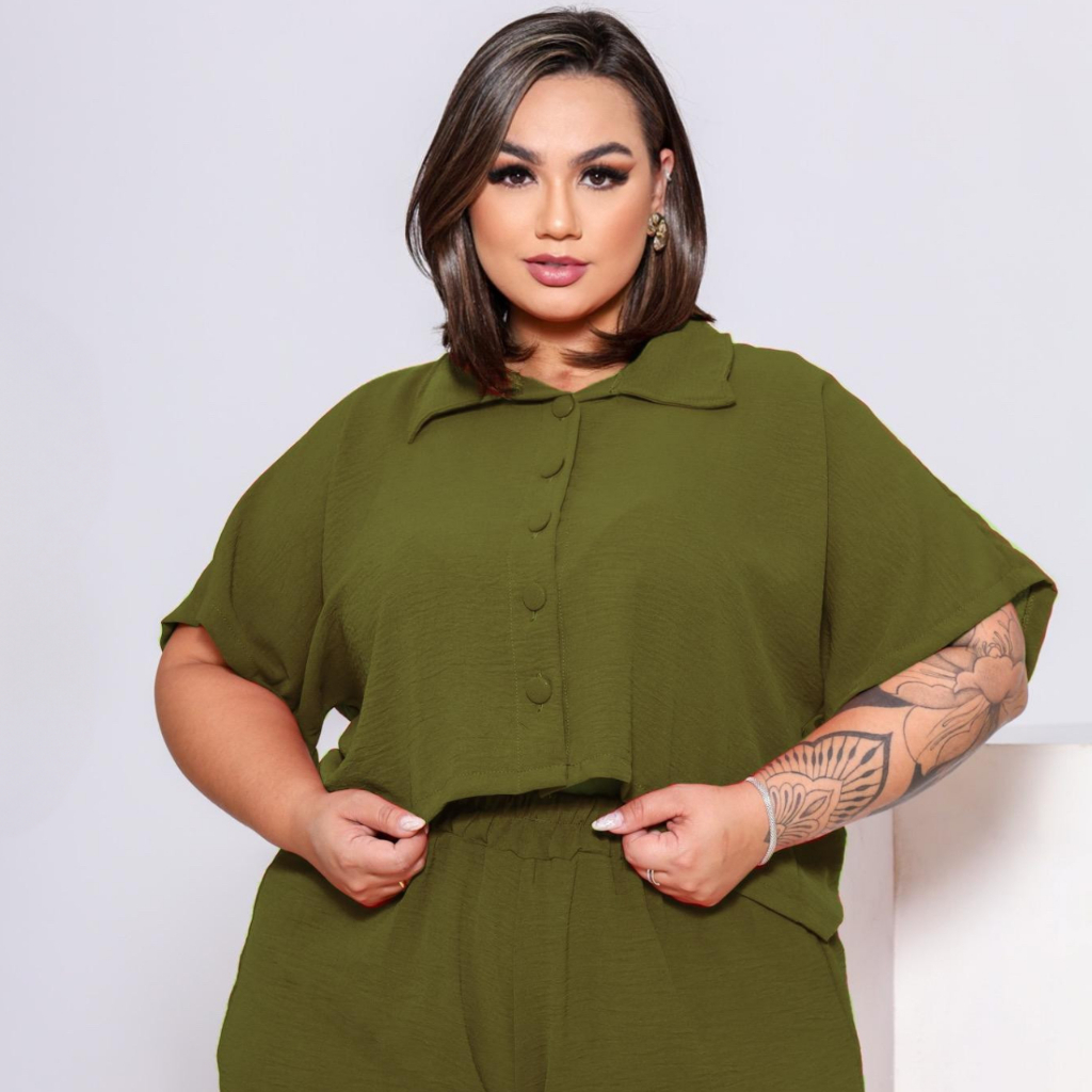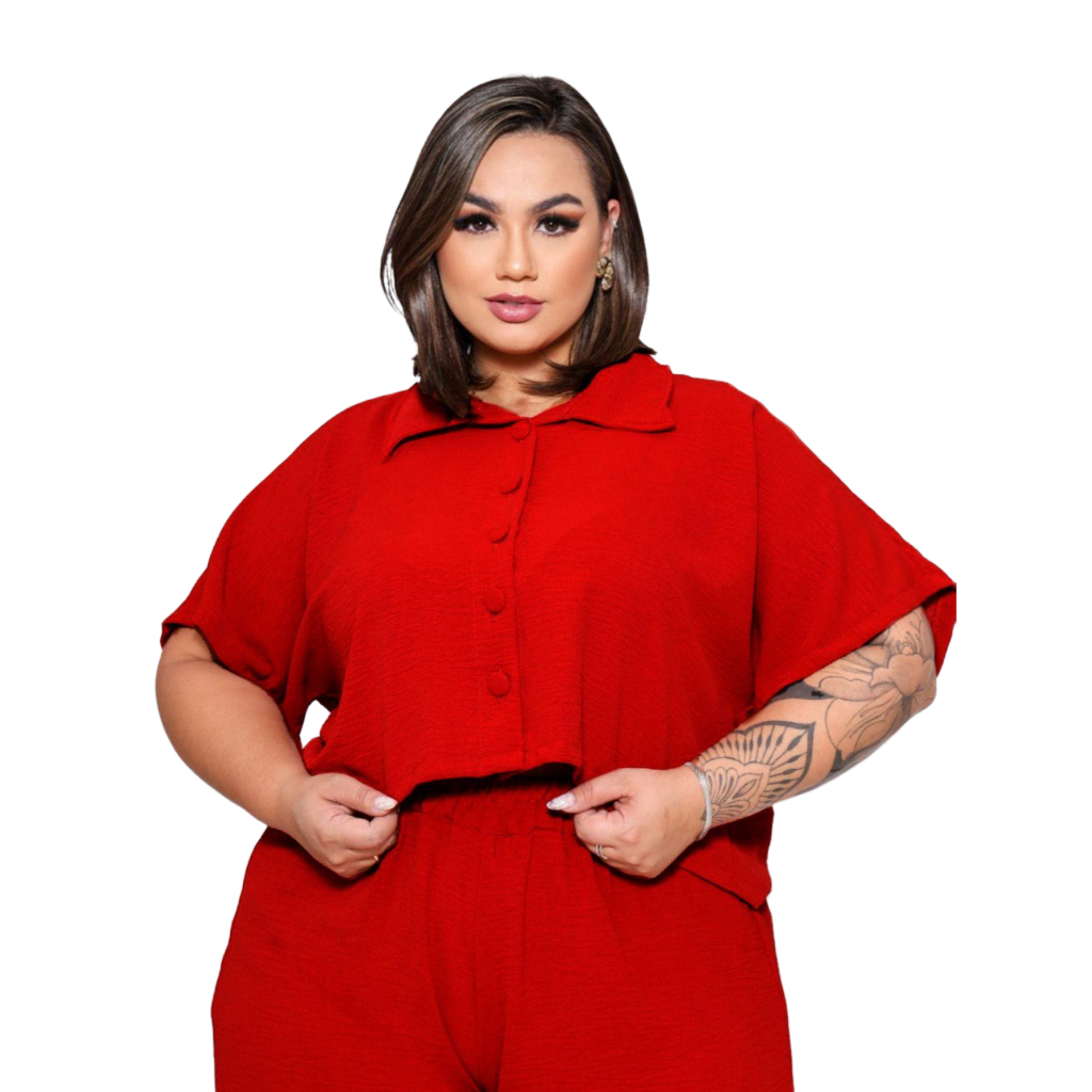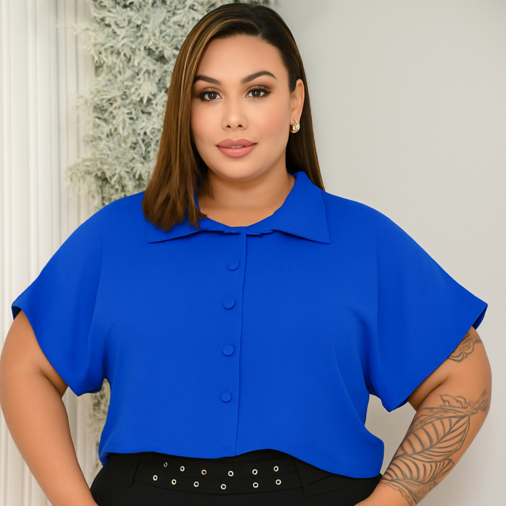 BLUSA ESTILO CAMISA PLUS SIZE MANGA CURTA BOTÕES FORRADOS TECIDO LEVE DUNA LOOK PLU SIZE