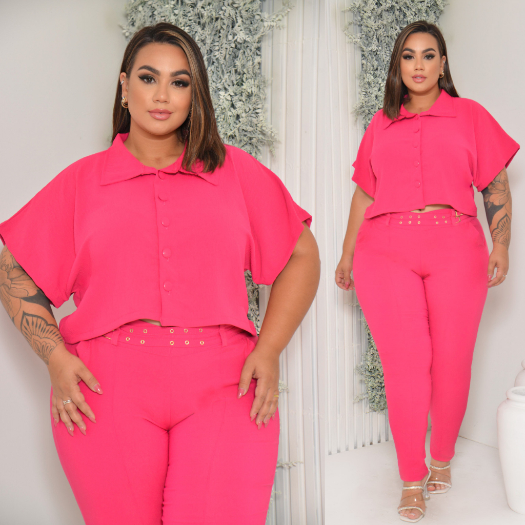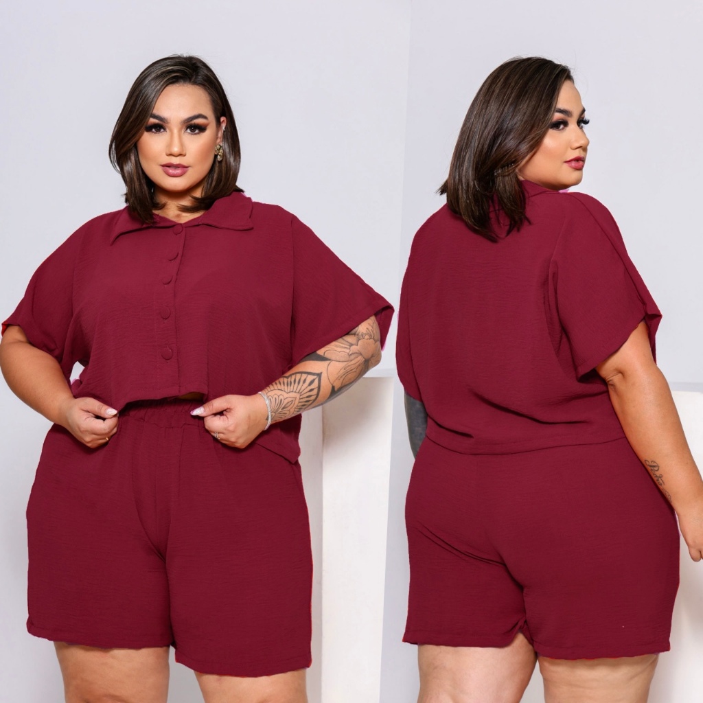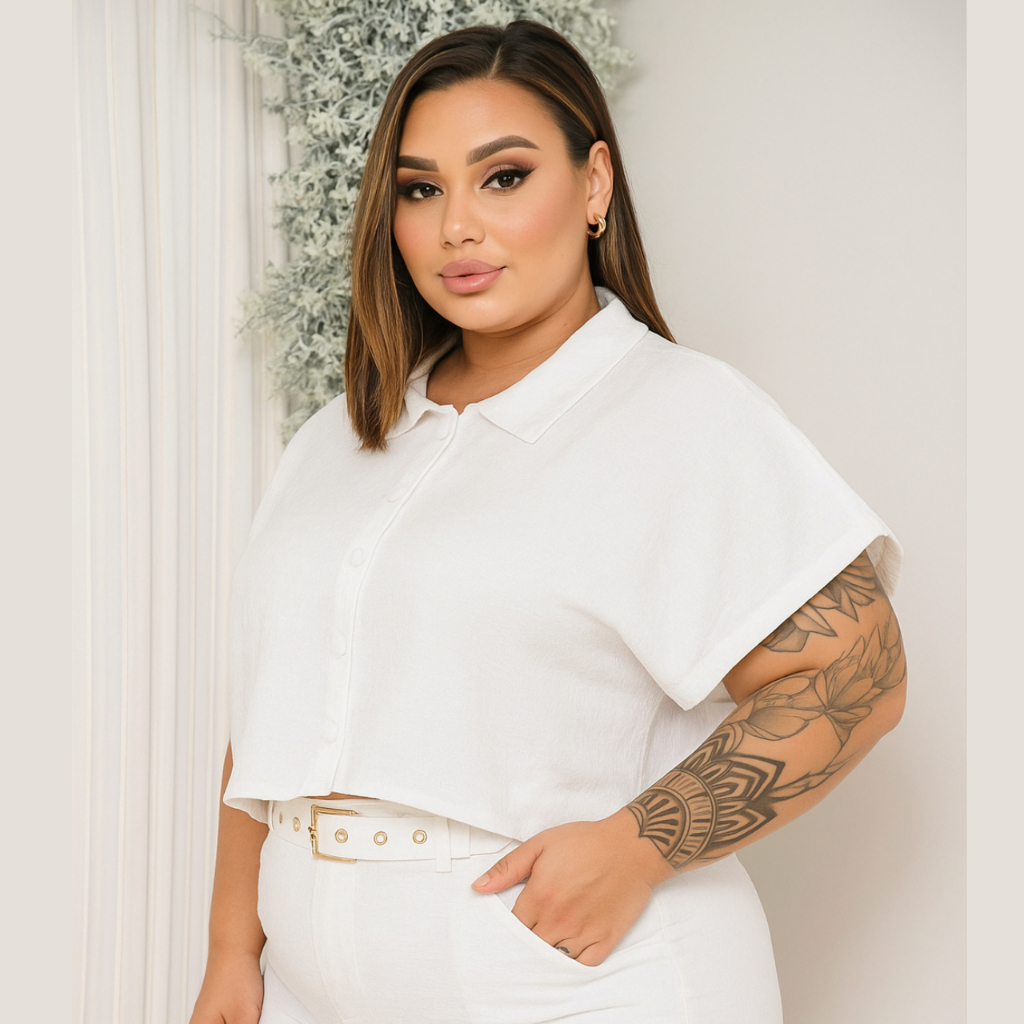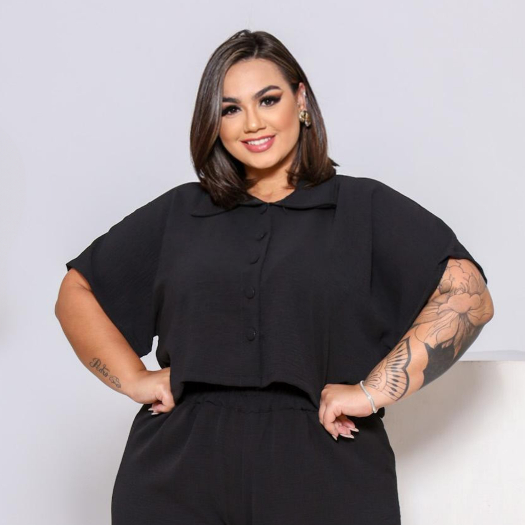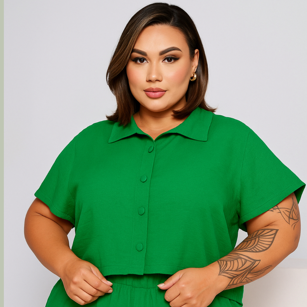 BLUSA ESTILO CAMISA PLUS SIZE MANGA CURTA BOTÕES FORRADOS TECIDO LEVE DUNA LOOK PLU SIZE