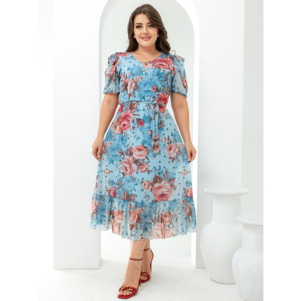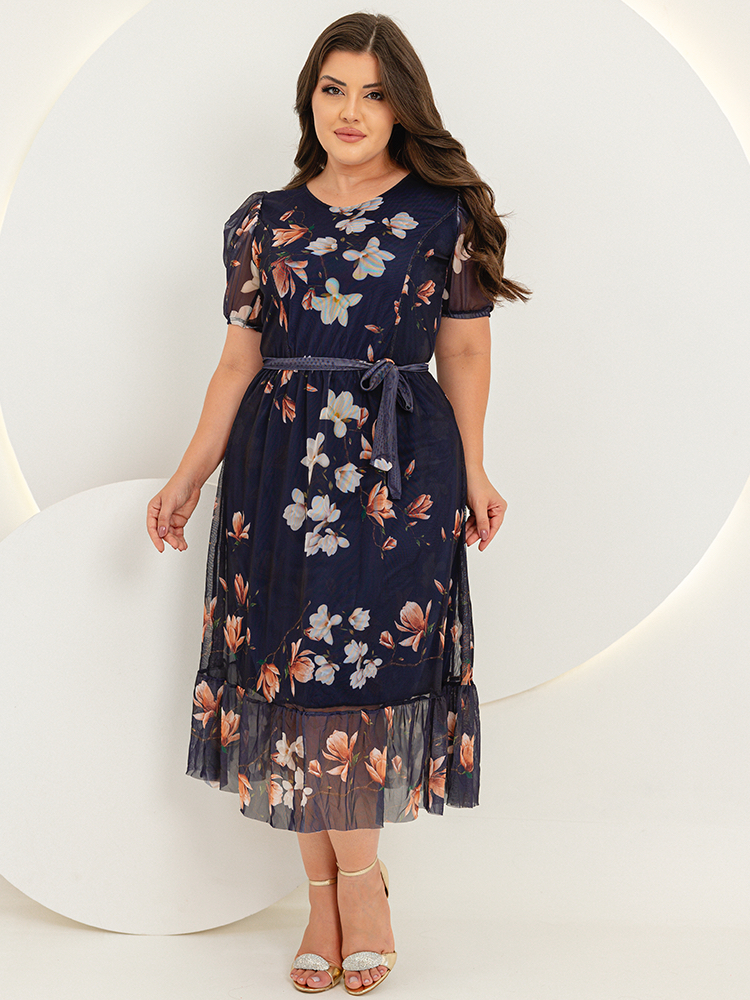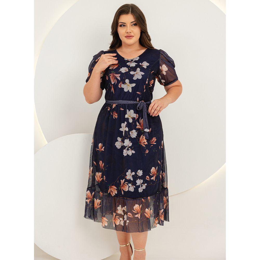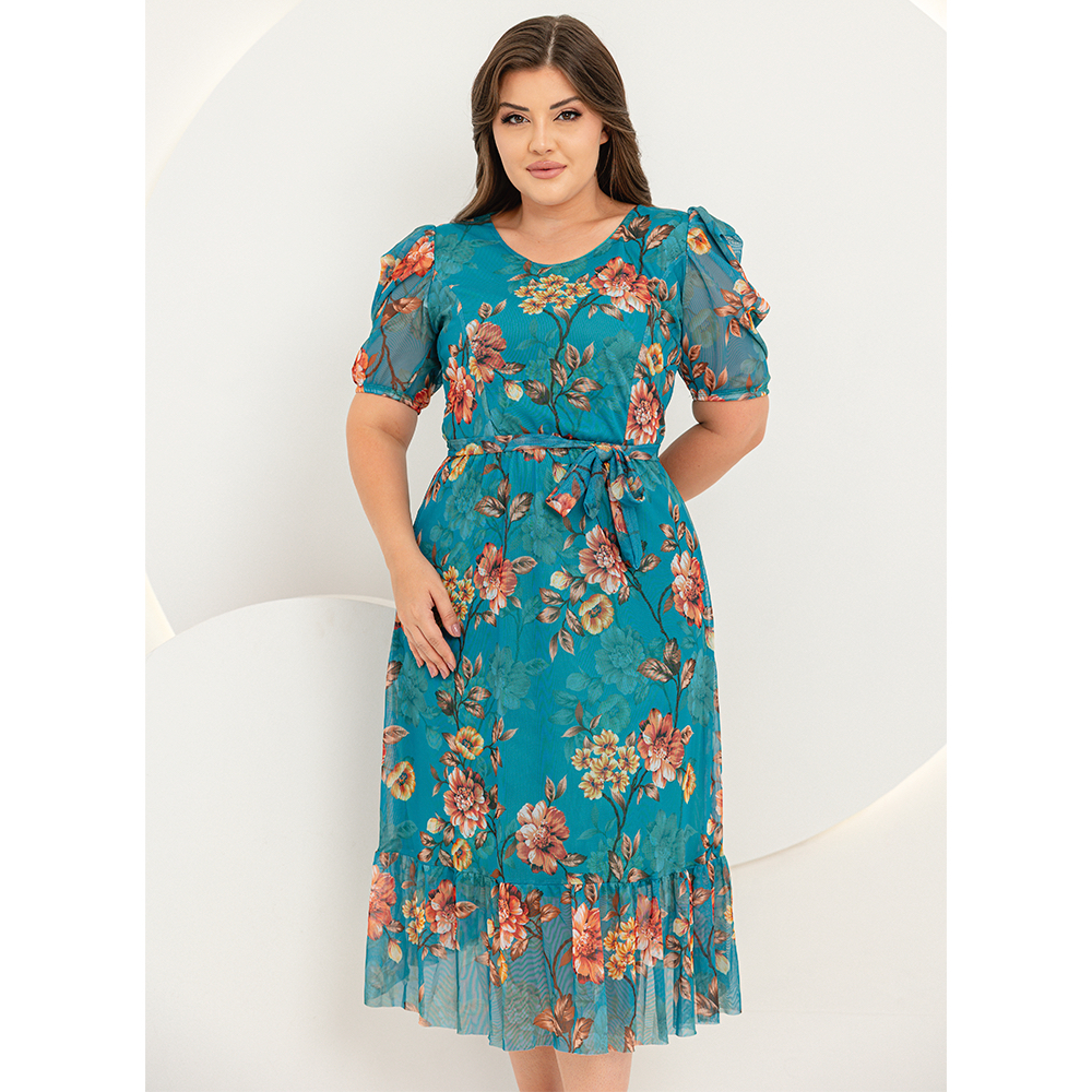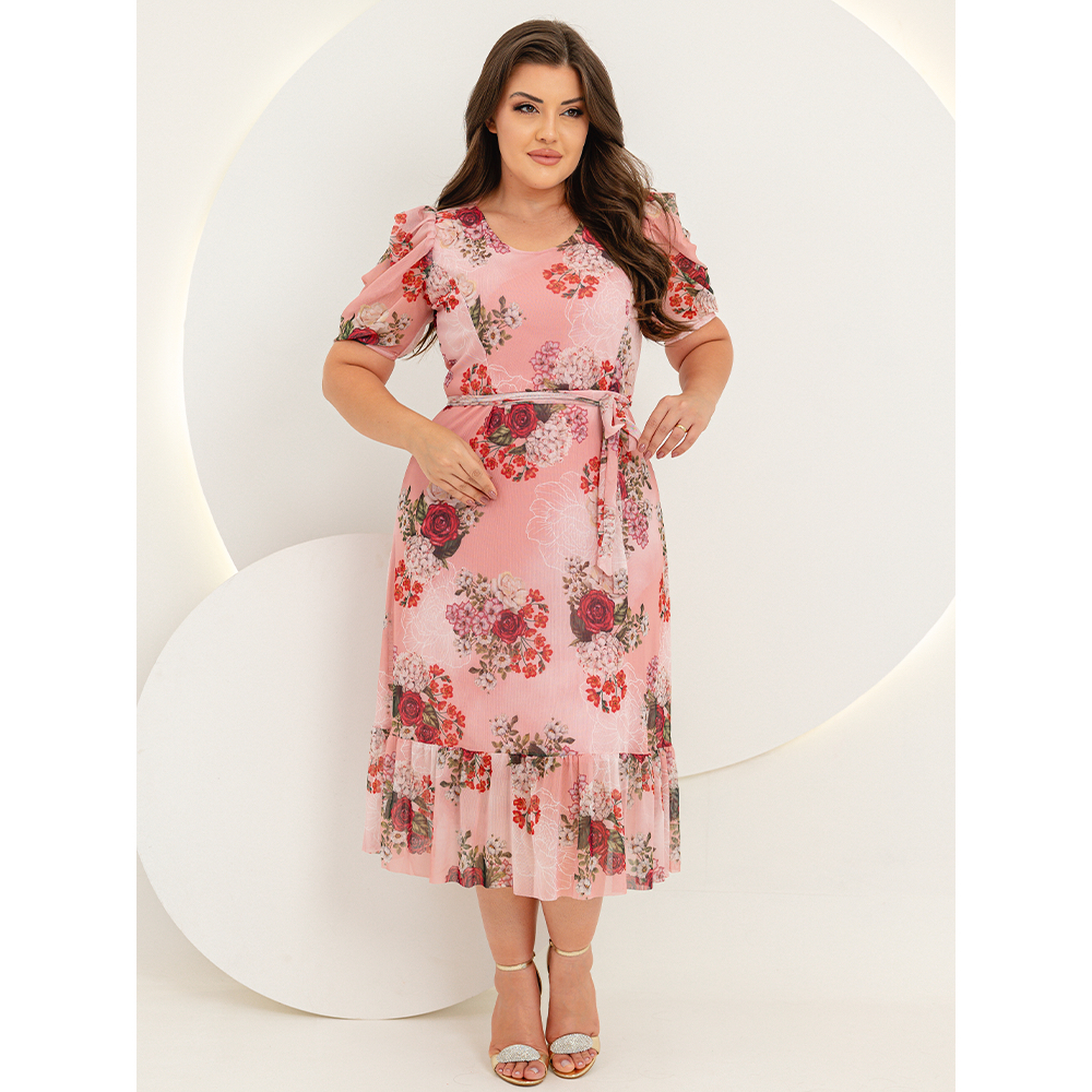 Vestido Midi Tule Estampado Plus Size Moda Evangelica Manga Bufante