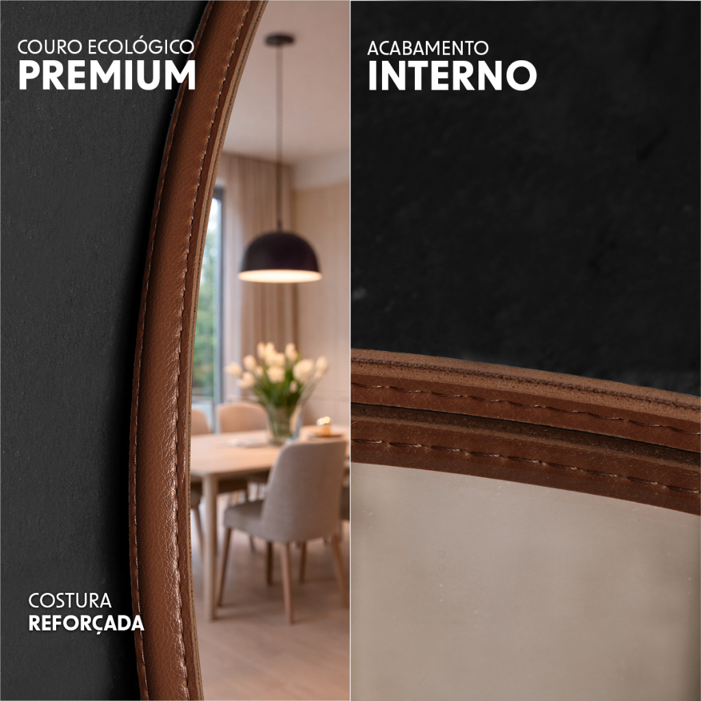 Espelho Adnet Couro Costurado + Suporte Fixação 60cm 50cm 40cm 30cm Sala Quarto Banheiro Hall