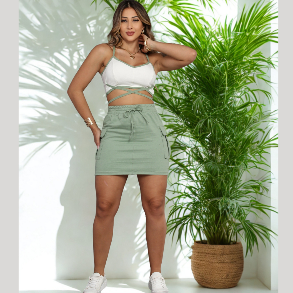 Conjunto Feminino Saia Cargo Moletinho +Blusinha de Ribana Duplo Tecido com Tiras/Moda Gringa Verão