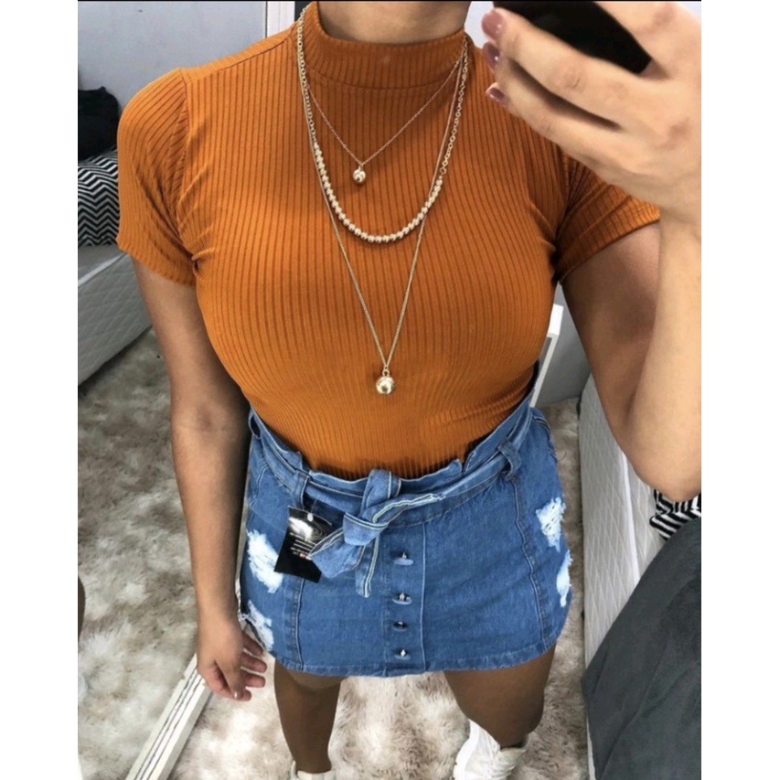 Kit com 3 Blusas Canelada Gola Alta com manga