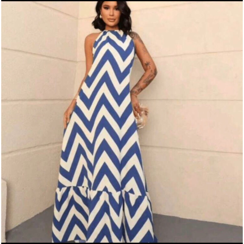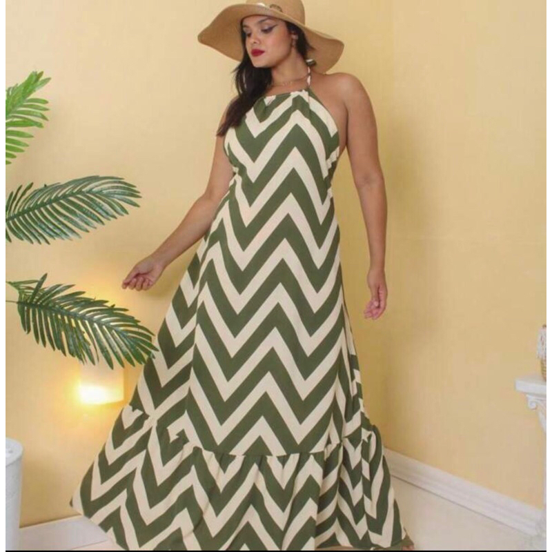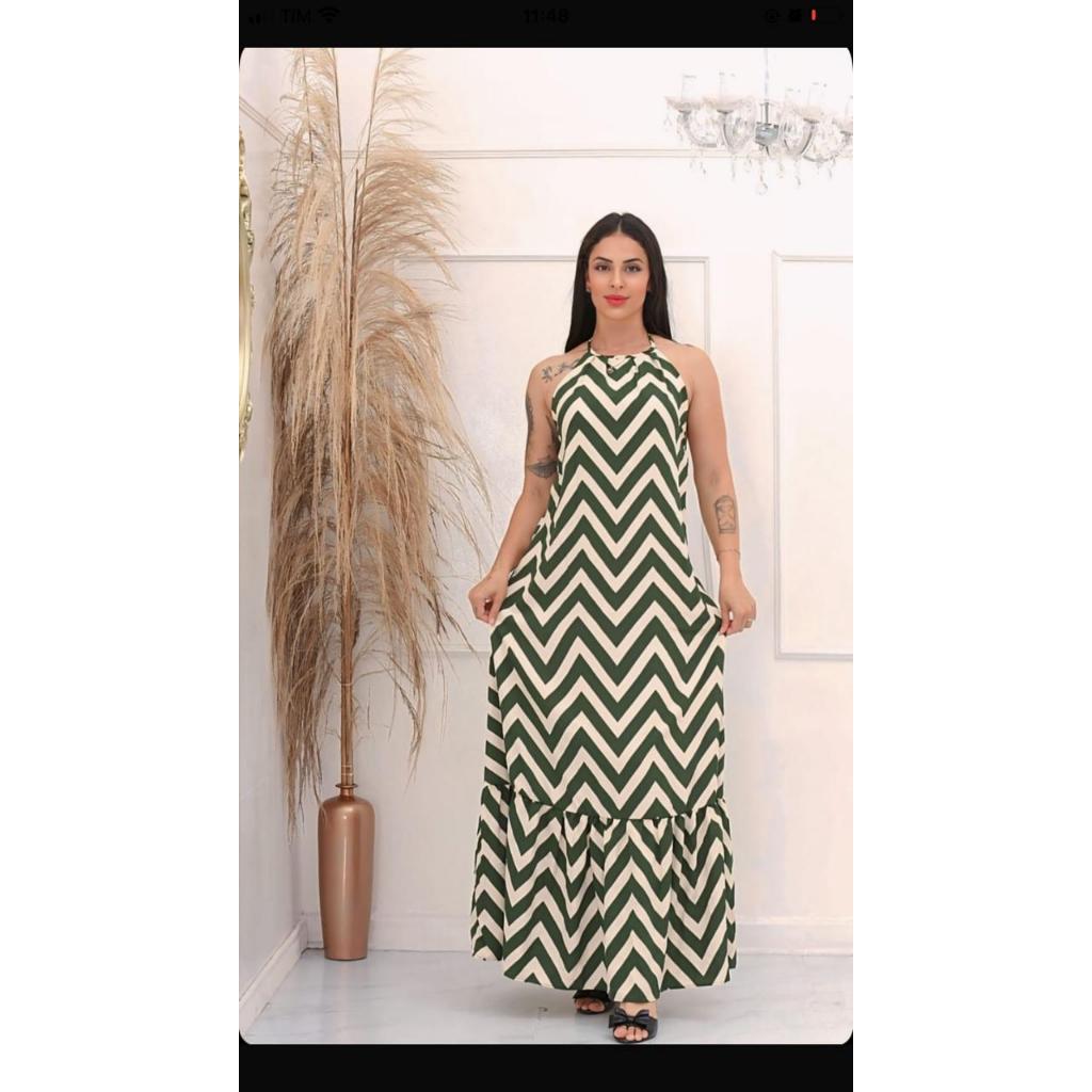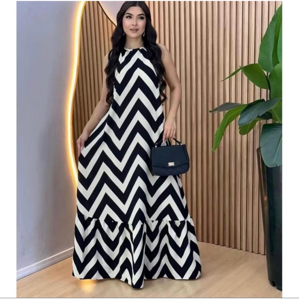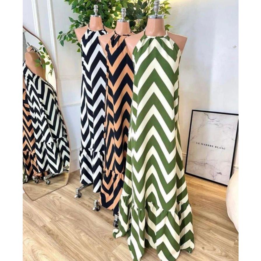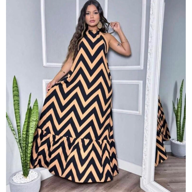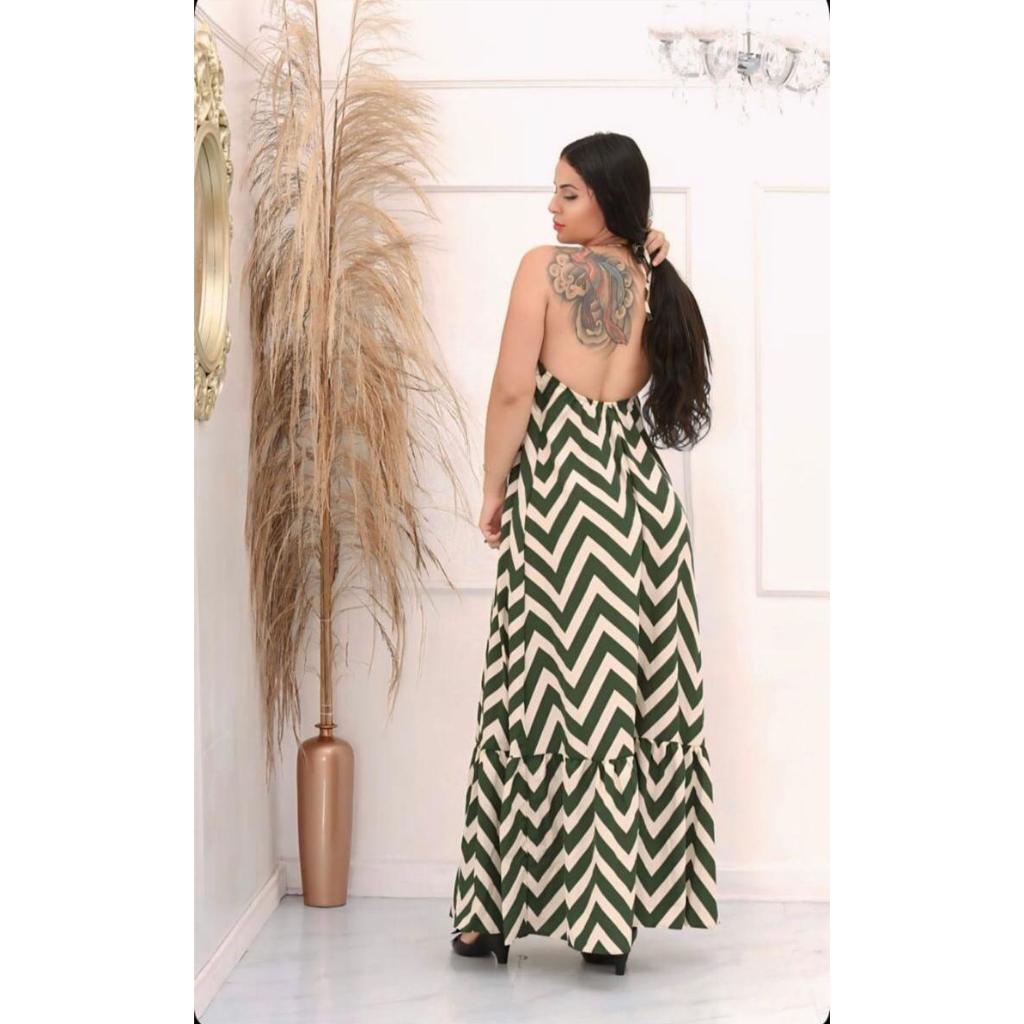 Vestido Feminino Longo Estampa Zig Zag Costas Nuas Com BoJo Tendência 2026 Verão