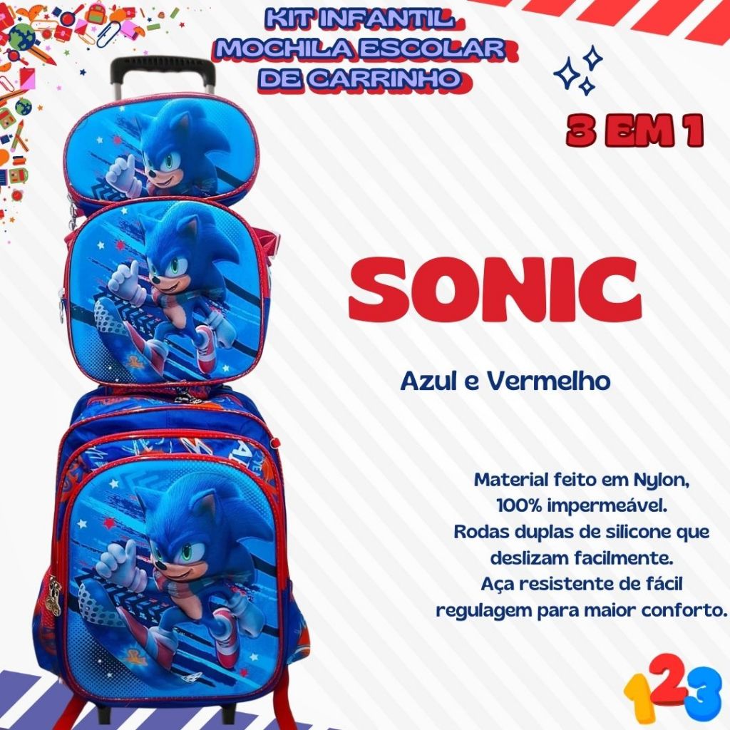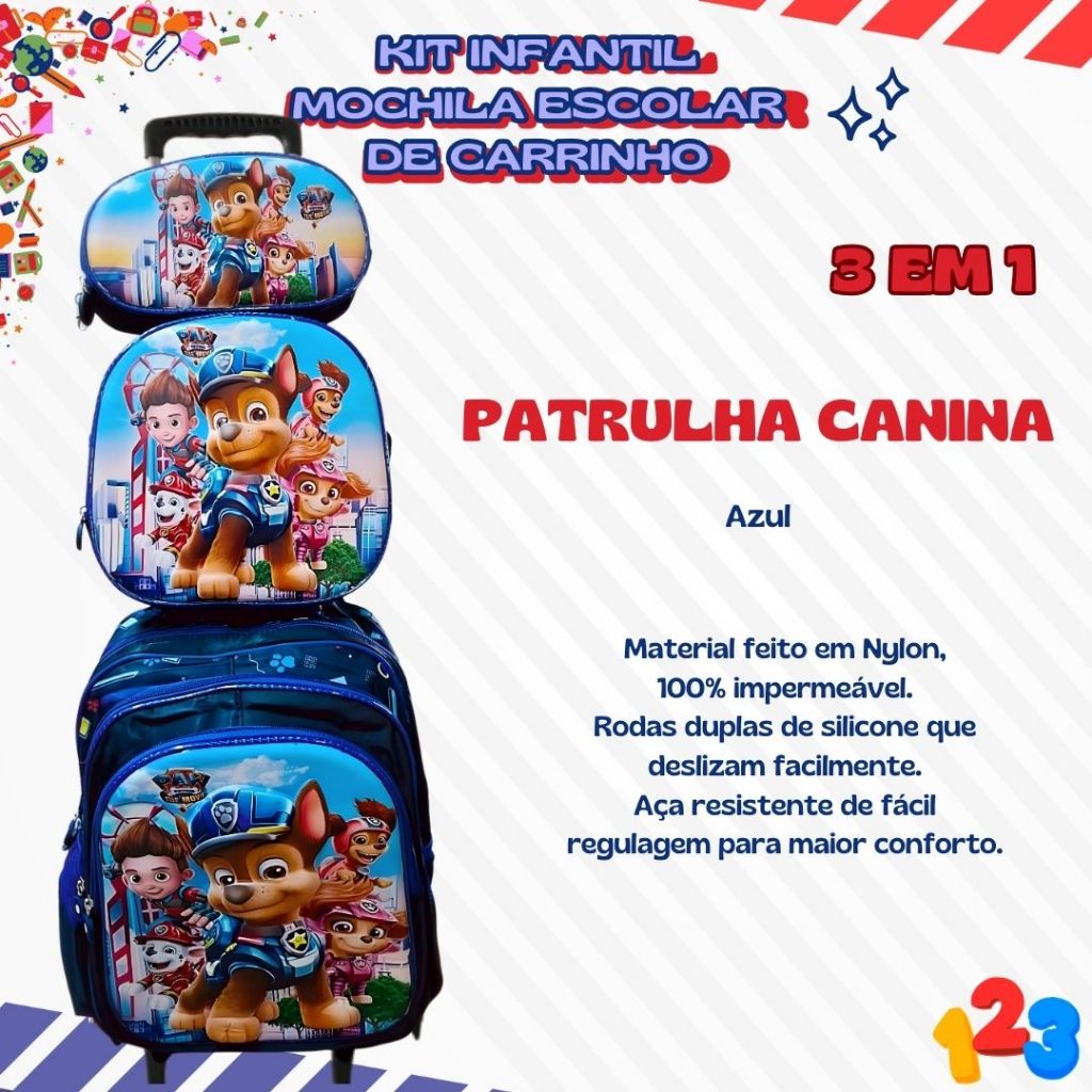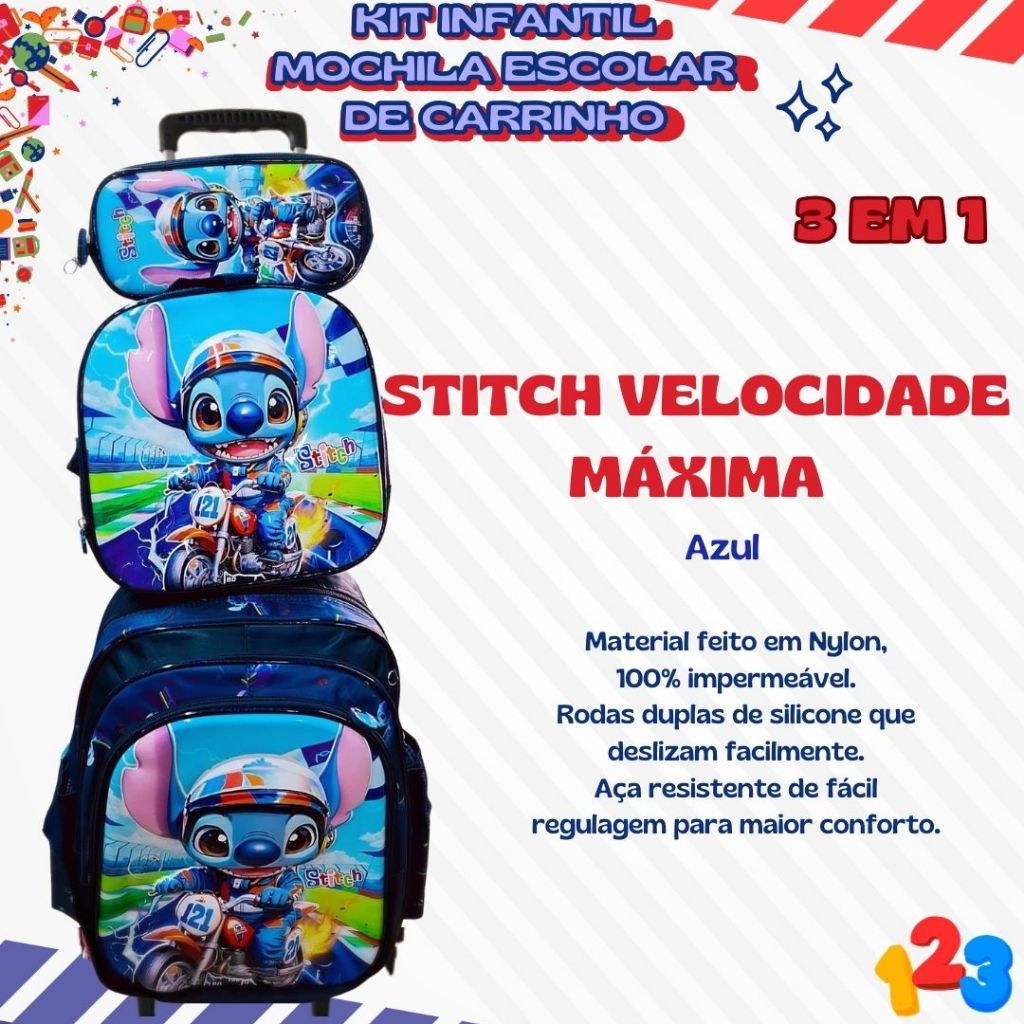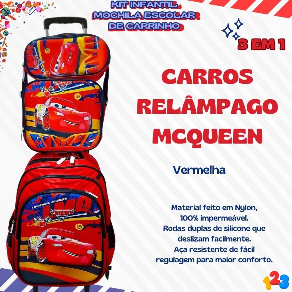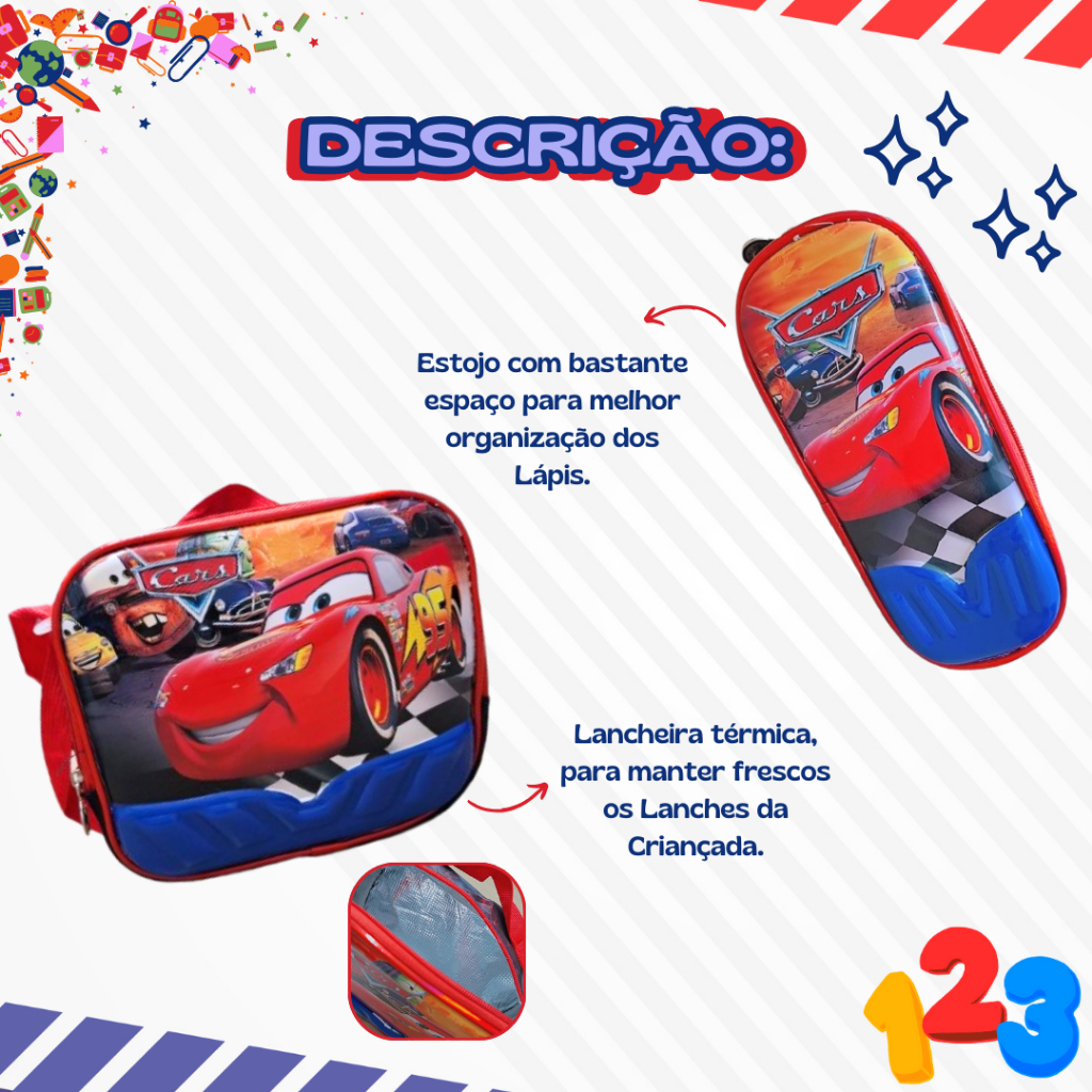 Mochila Escolar com Carrinho 3D para Menina e Menino - Kits com 3 peças Lancheira e Estojo Impermeável Desenhos Diversos