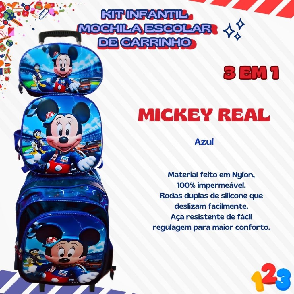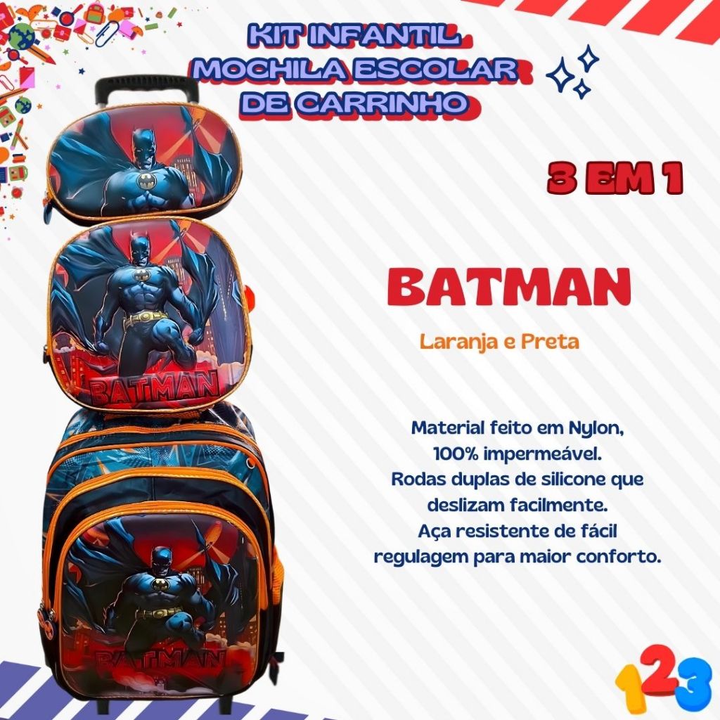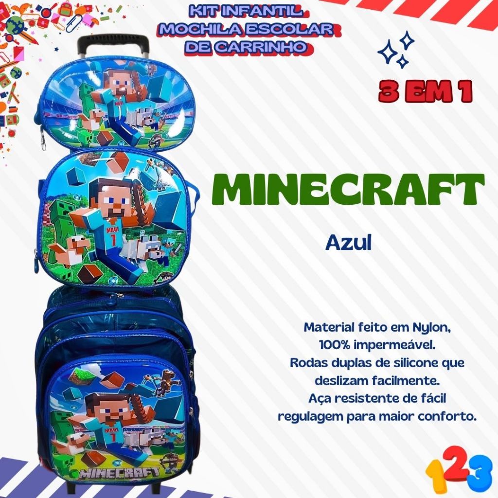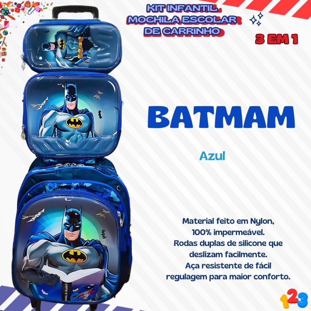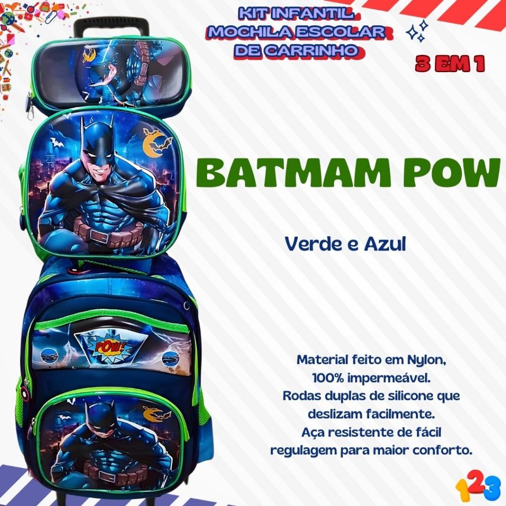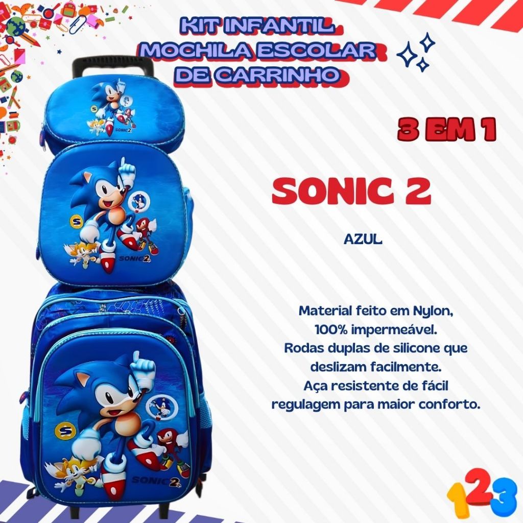 Mochila Escolar com Carrinho 3D para Menina e Menino - Kits com 3 peças Lancheira e Estojo Impermeável Desenhos Diversos
