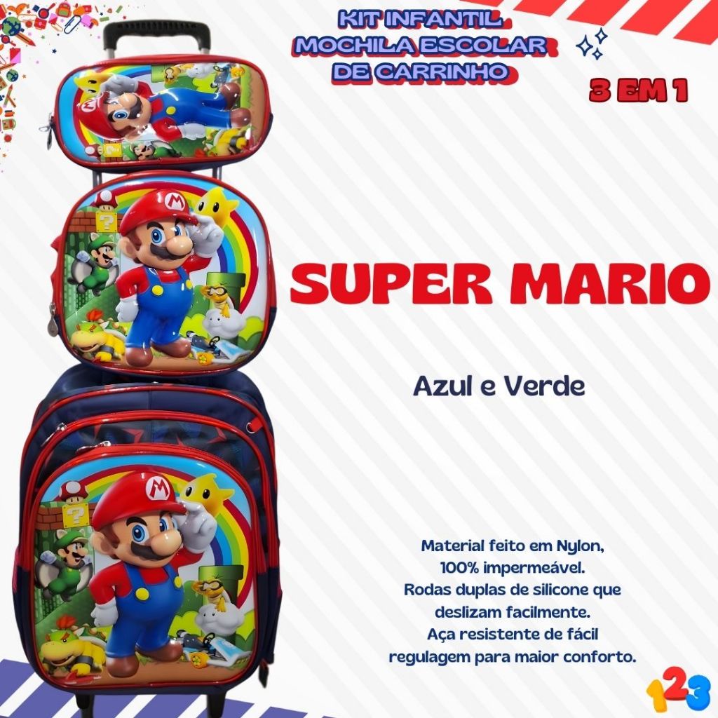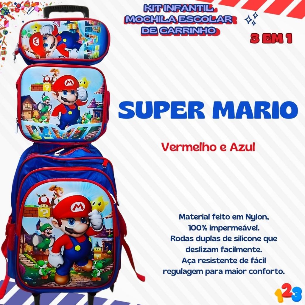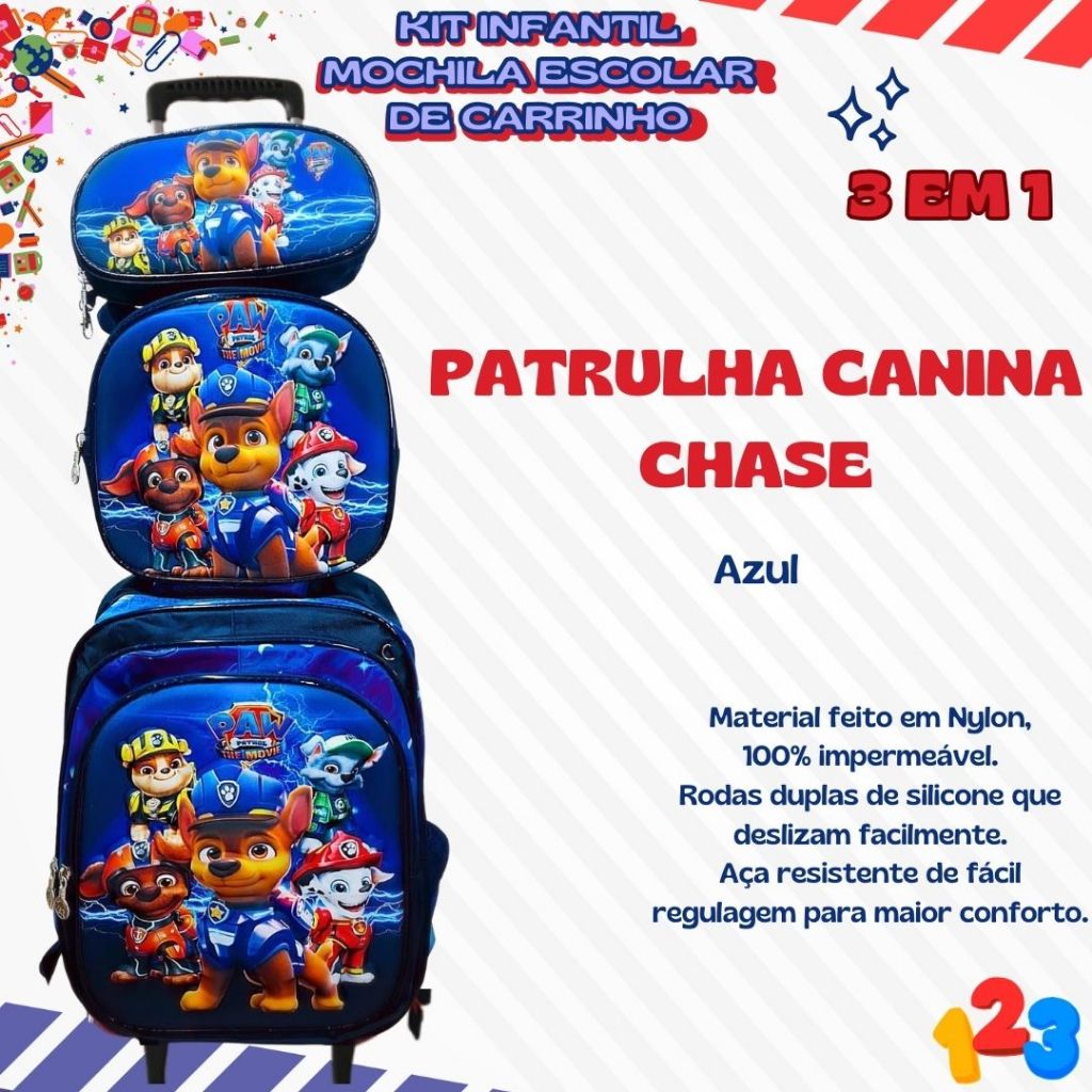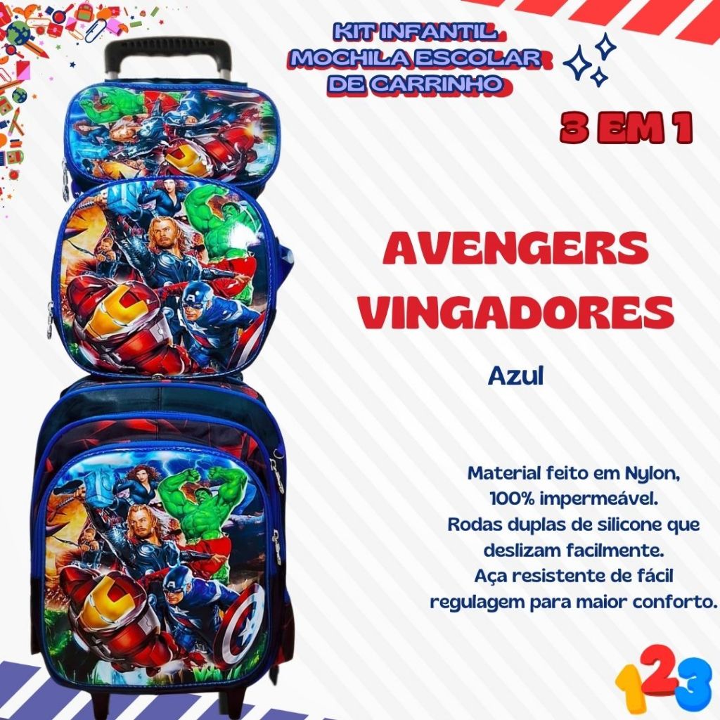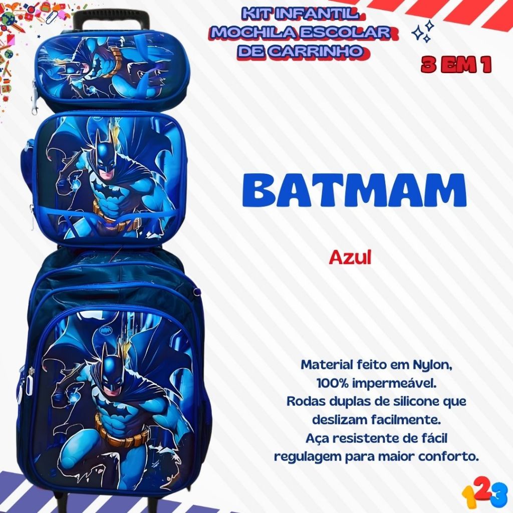 Mochila Escolar com Carrinho 3D para Menina e Menino - Kits com 3 peças Lancheira e Estojo Impermeável Desenhos Diversos