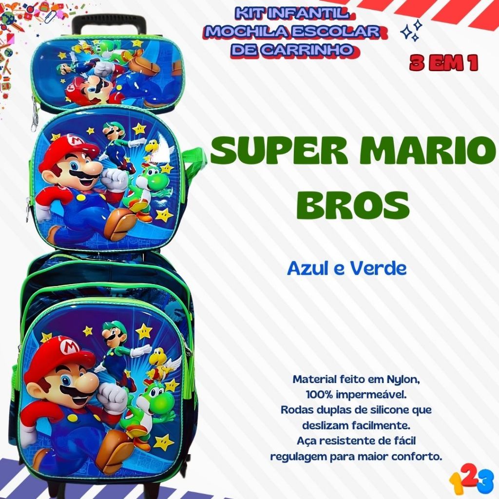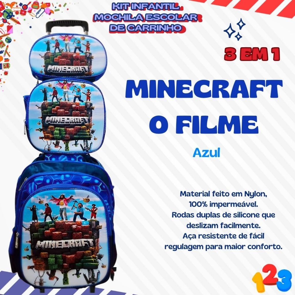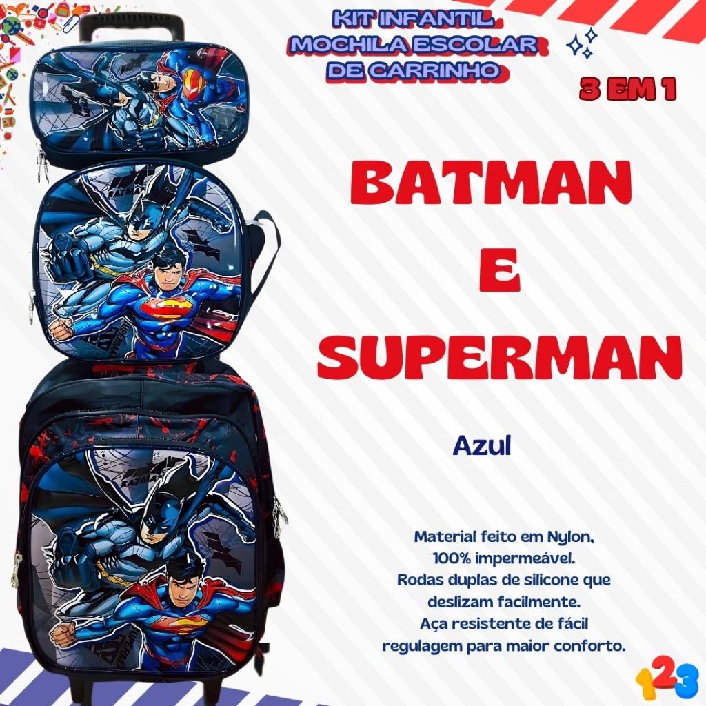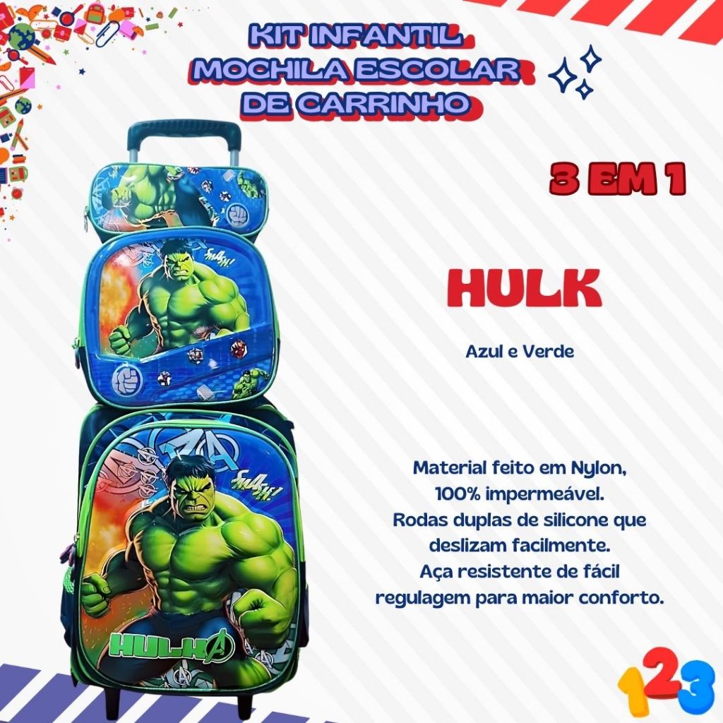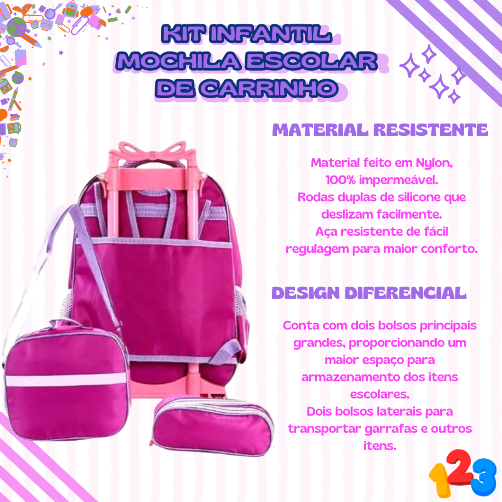Mochila Escolar com Carrinho 3D para Menina e Menino - Kits com 3 peças Lancheira e Estojo Impermeável Desenhos Diversos