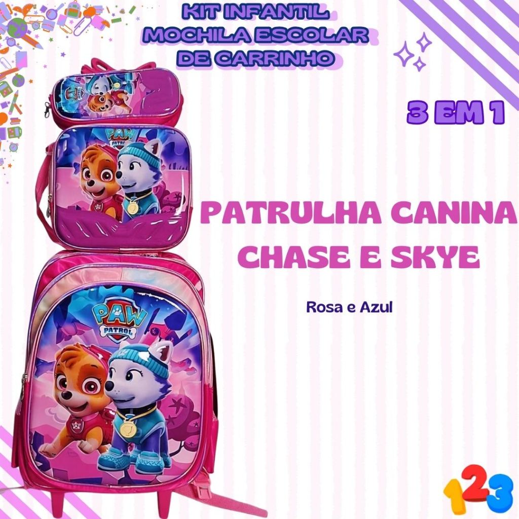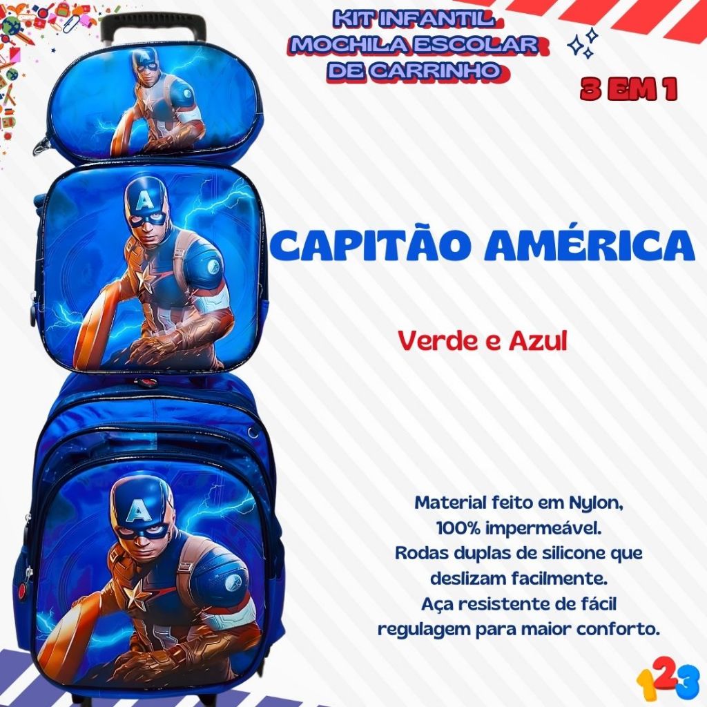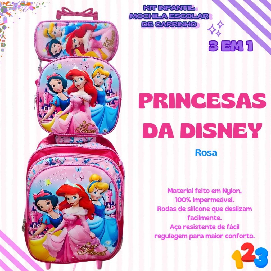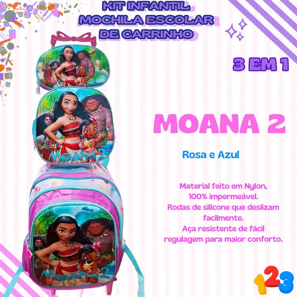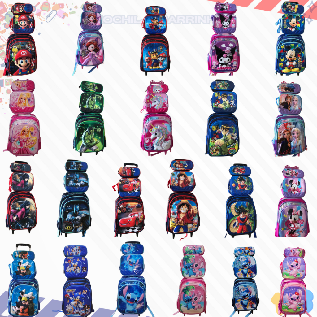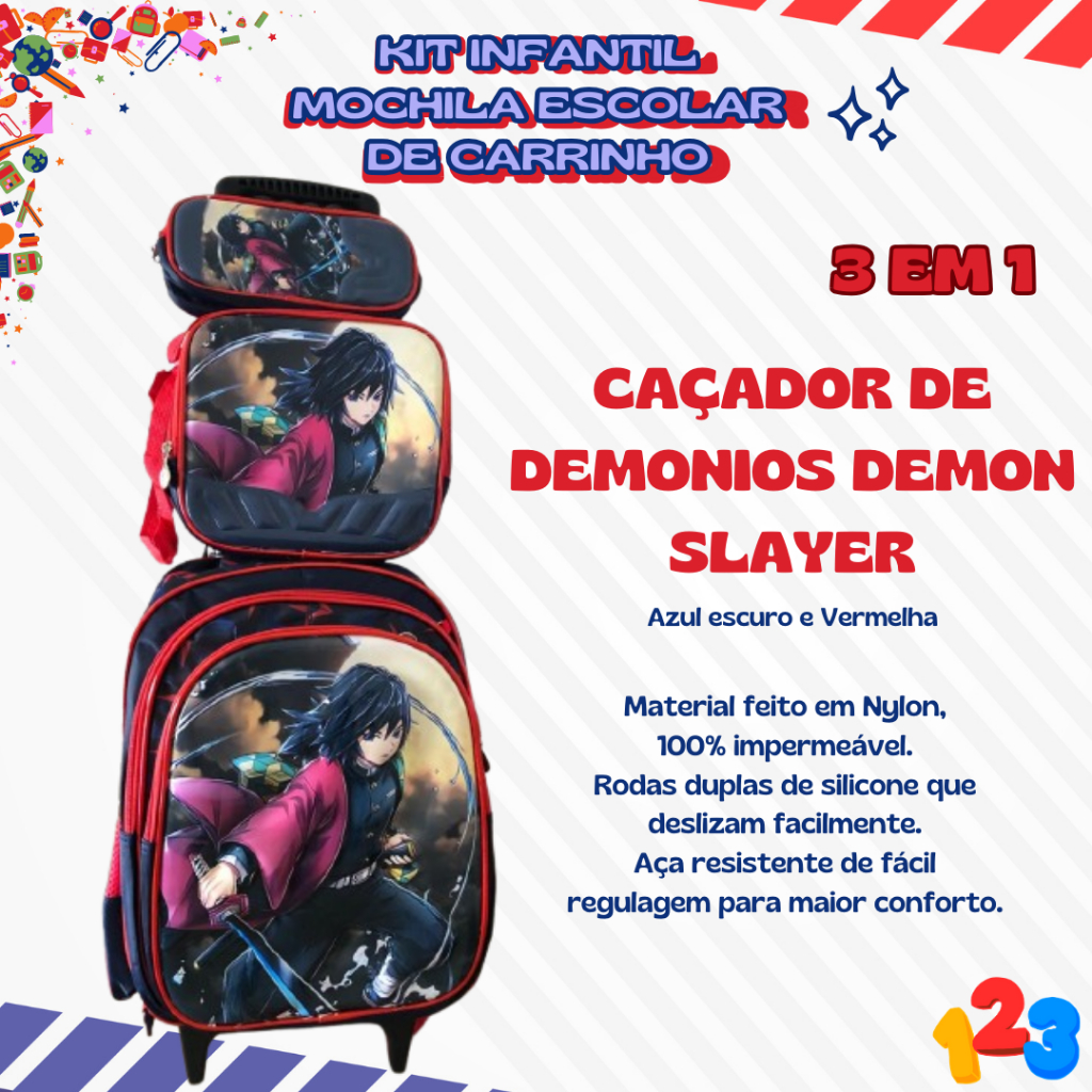 Mochila Escolar com Carrinho 3D para Menina e Menino - Kits com 3 peças Lancheira e Estojo Impermeável Desenhos Diversos