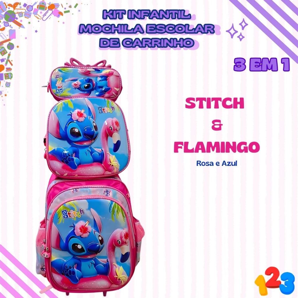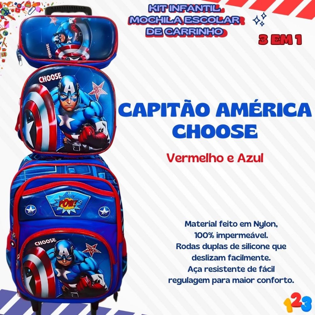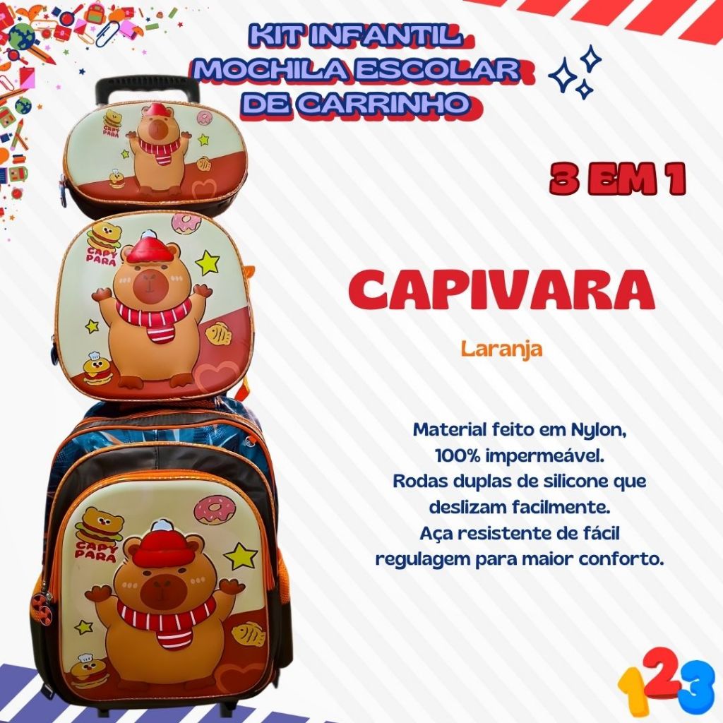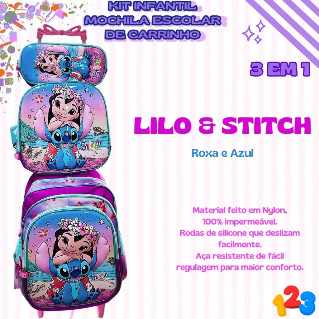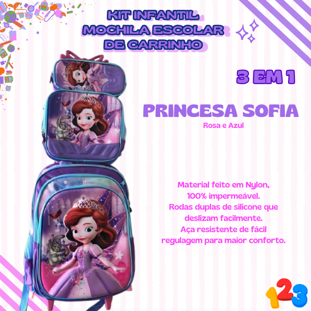 Mochila Escolar com Carrinho 3D para Menina e Menino - Kits com 3 peças Lancheira e Estojo Impermeável Desenhos Diversos