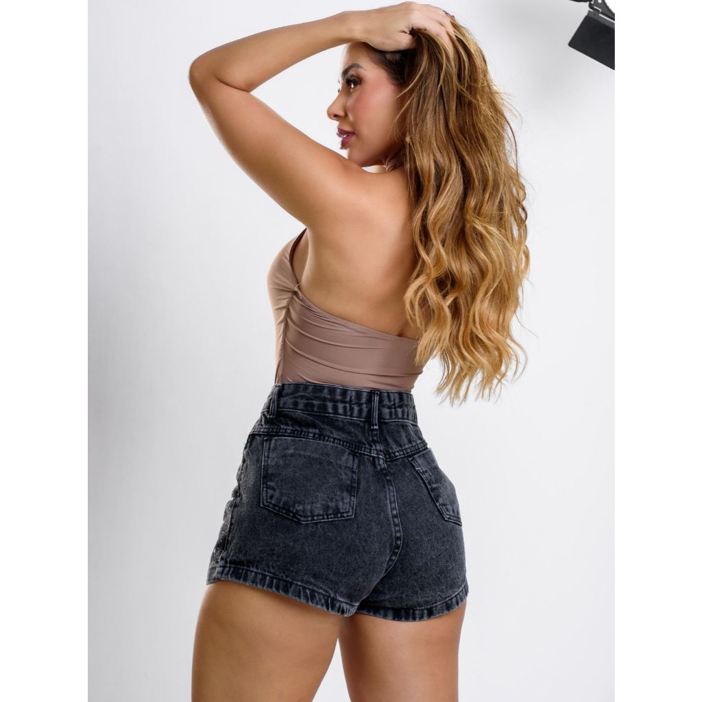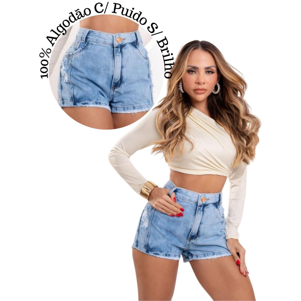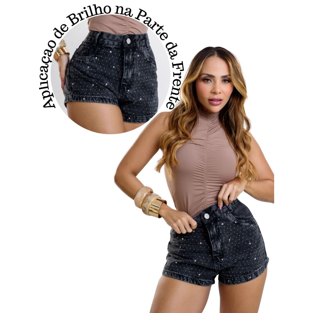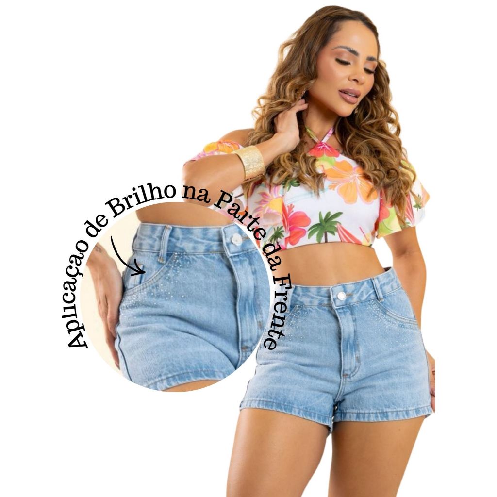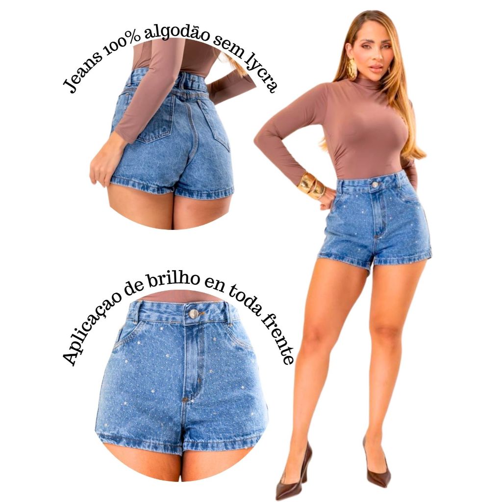 Short Jeans Feminino Cintura Alta com Strass sem lycra