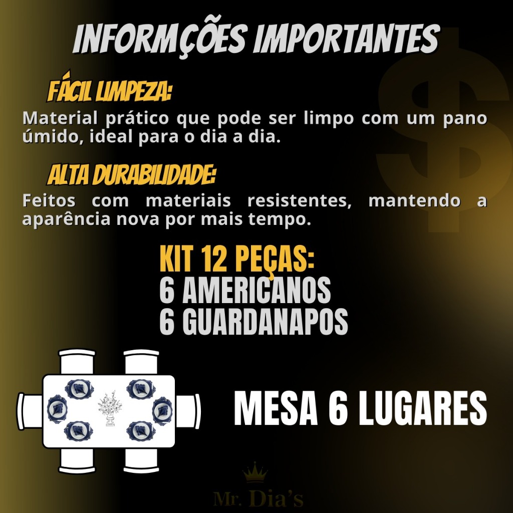 Kit Jogo Americano 12 Pçs Souplats Para Mesa De 6 Lugares Mesa Posta Guardanapo Supla Jantar