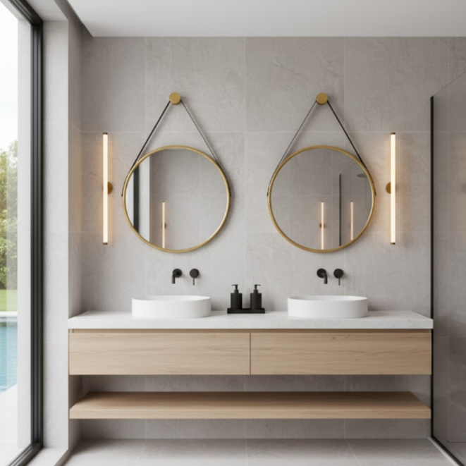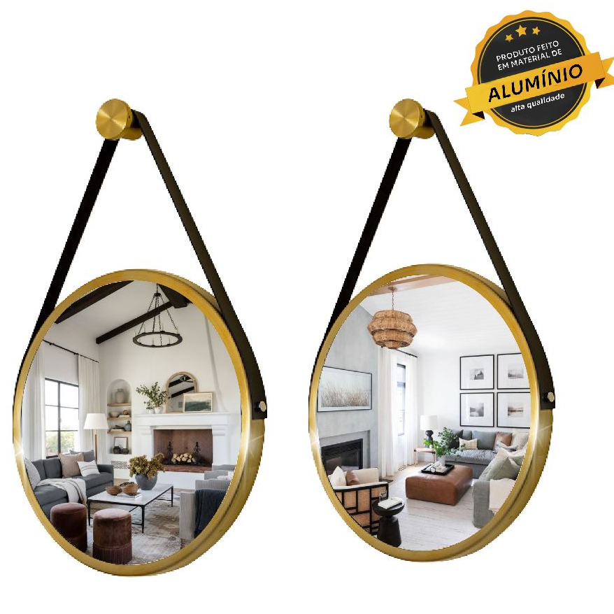 Kit 2 Espelhos Redondo Adnet Decorativo Suspenso com Alça 40cm + Suporte Dourado com Alça Preta