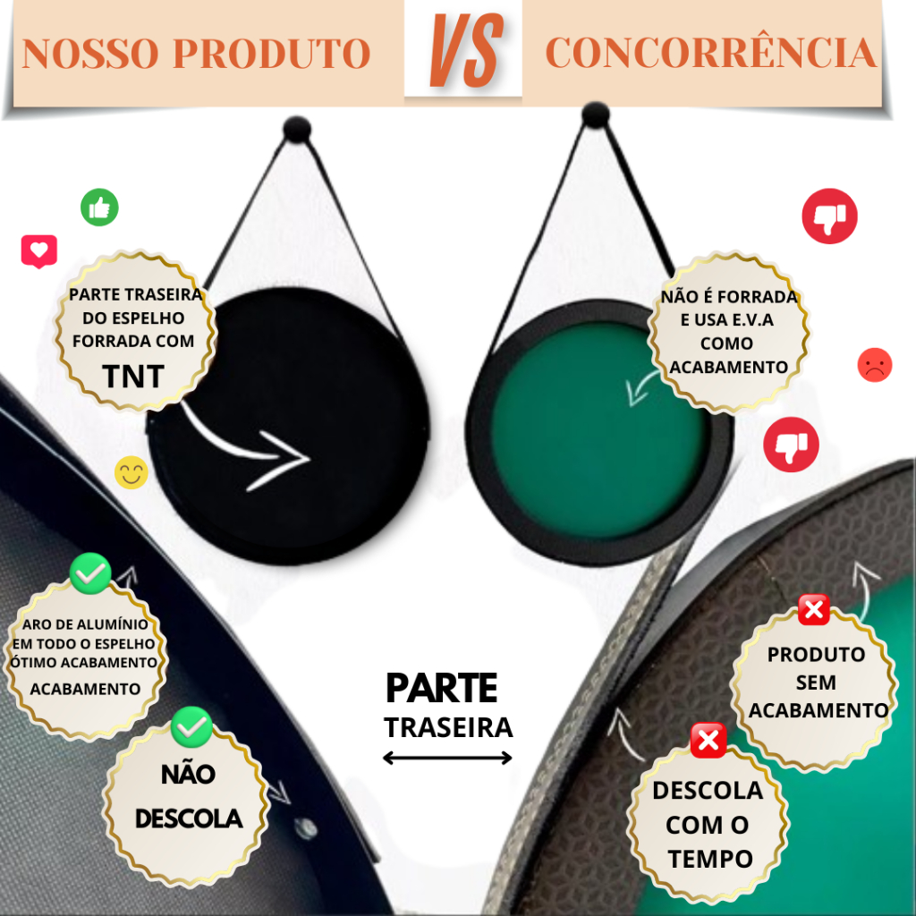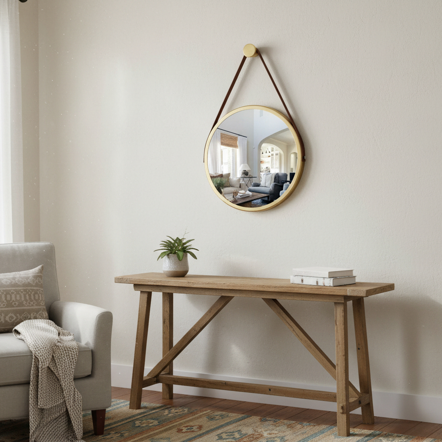 Espelho Redondo Adnet Decorativo Suspenso com Alça 60cm + Suporte Dourado com Alça Caramelo