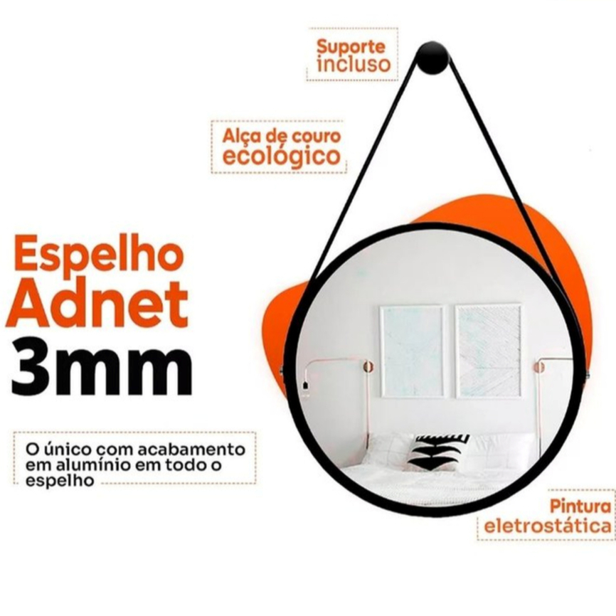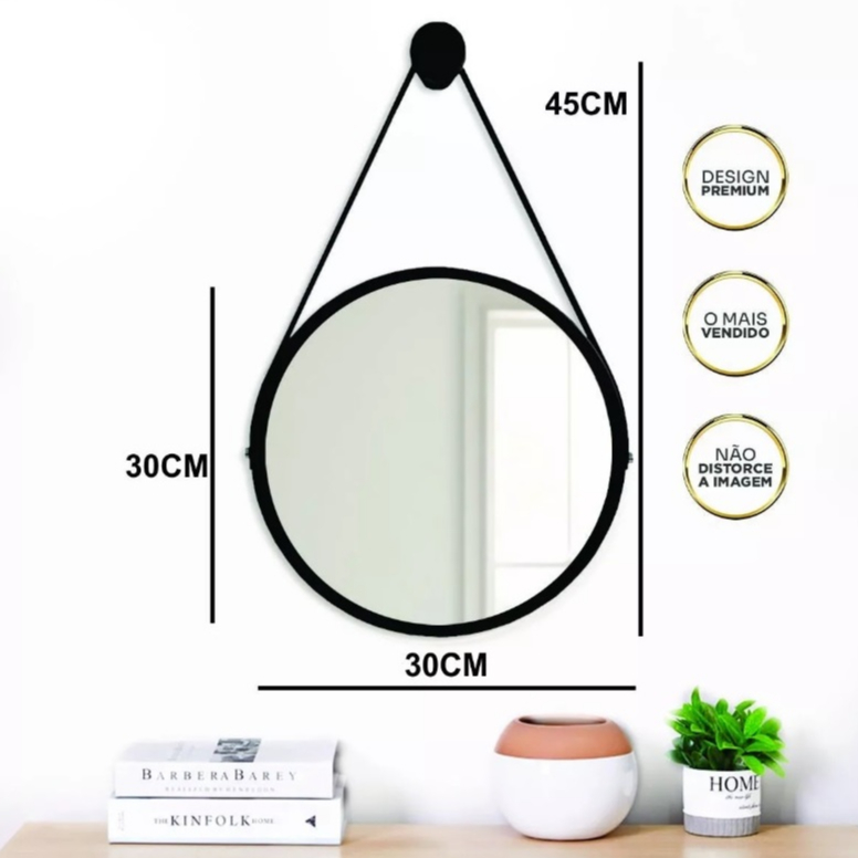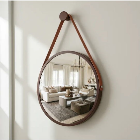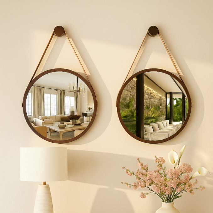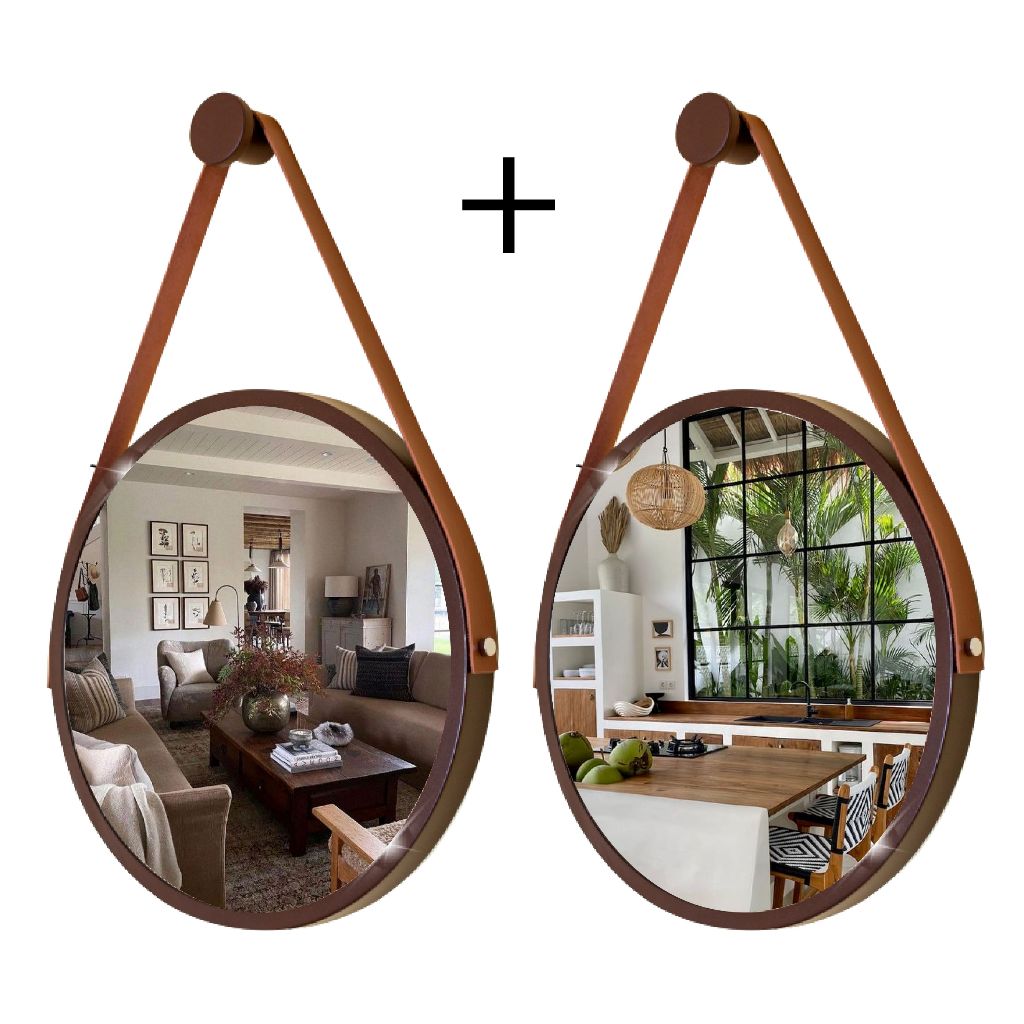 Kit 2 Espelhos Redondos Decorativos 30cm Adnet Suspenso com Alça Suporte Marrom/Caramelo