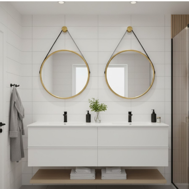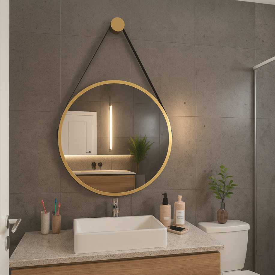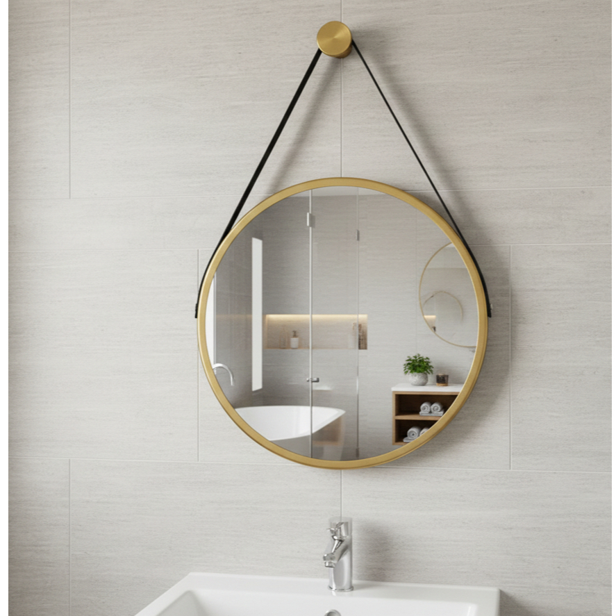 Espelho Redondo Adnet Decorativo Suspenso com Alça 60cm + Suporte Dourado com Alça Preta