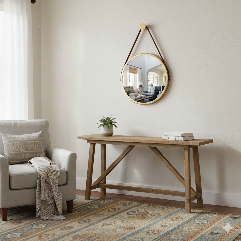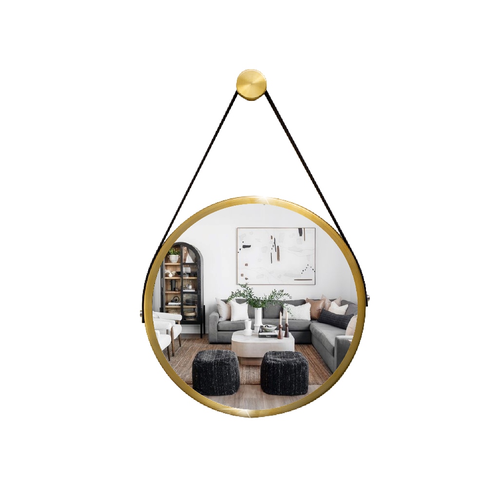 Espelho Redondo Adnet Decorativo Suspenso com Alça 40cm + Suporte Dourado com Alça Caramelo
