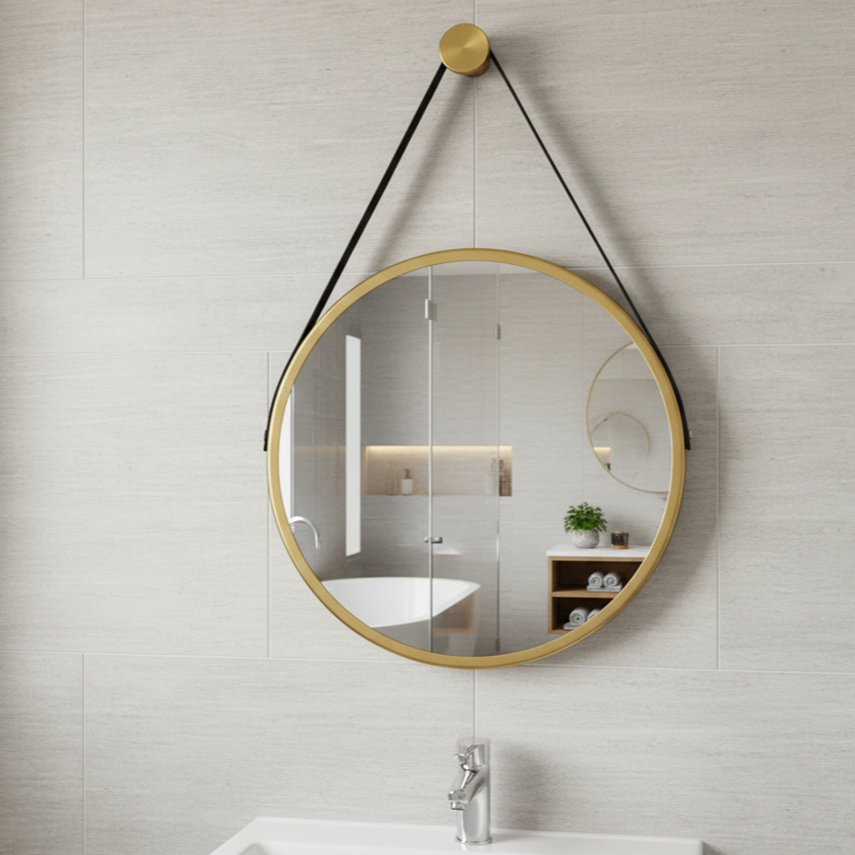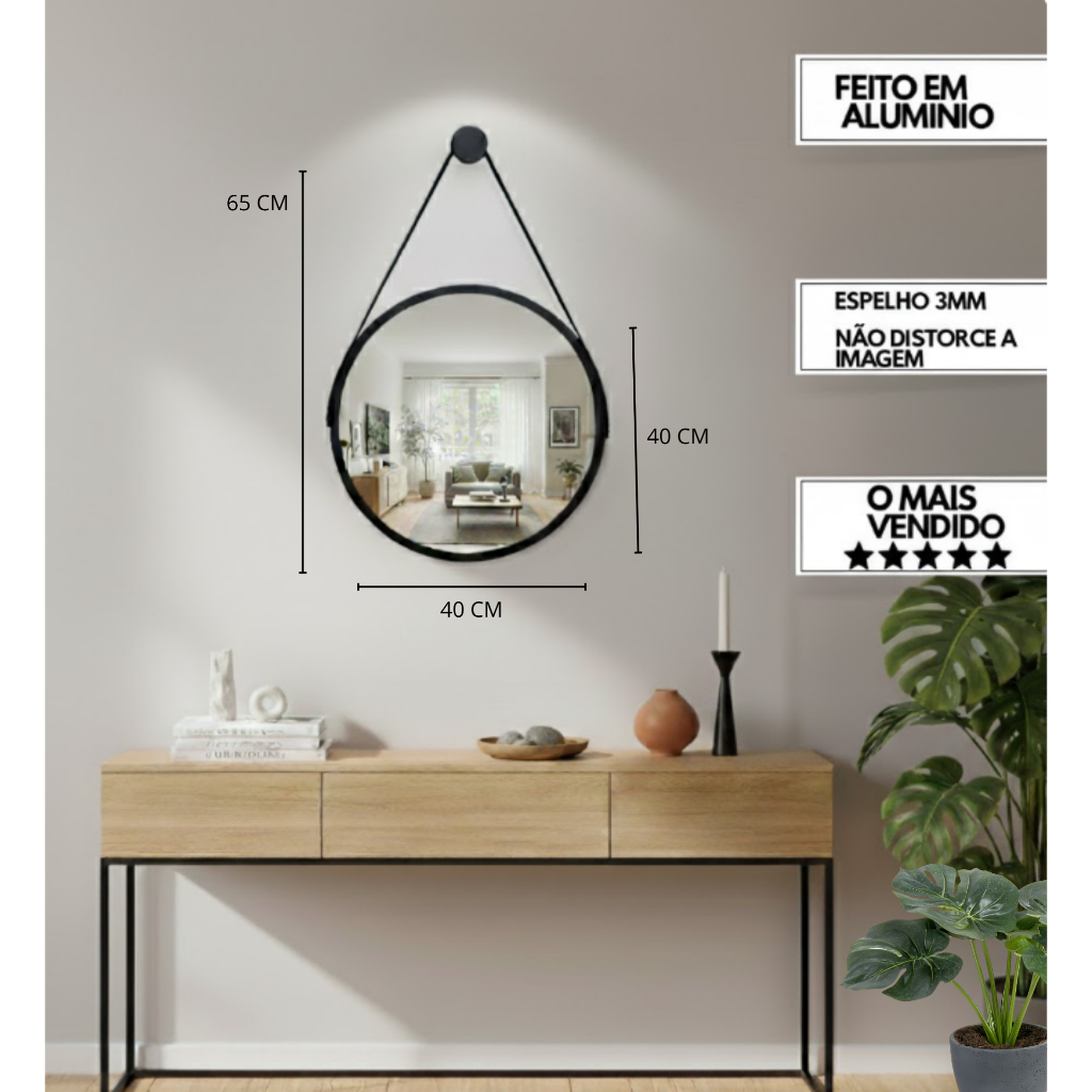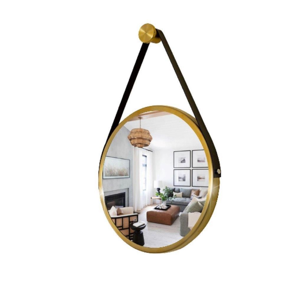 Espelho Redondo Decorativo Adnet Suspenso com Alça 40cm + Suporte Dourado com Alça Preta