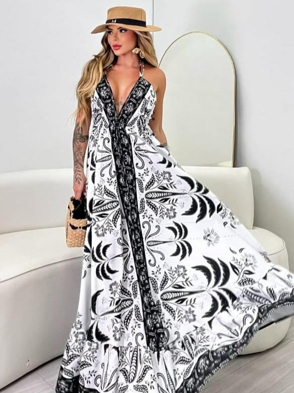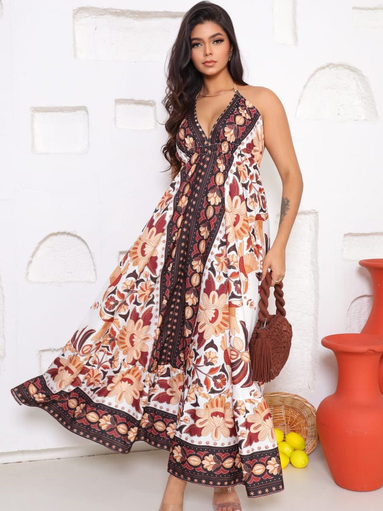 Vestido Longo Feminino de Amarrar Alça Fina Decote V Costas Aberta Estampado Inspiração Indiana