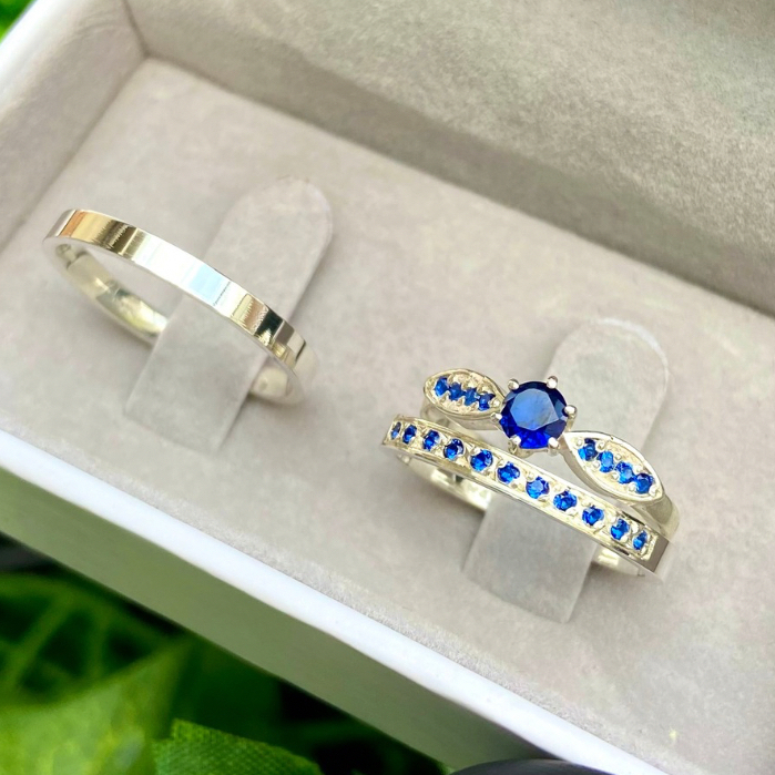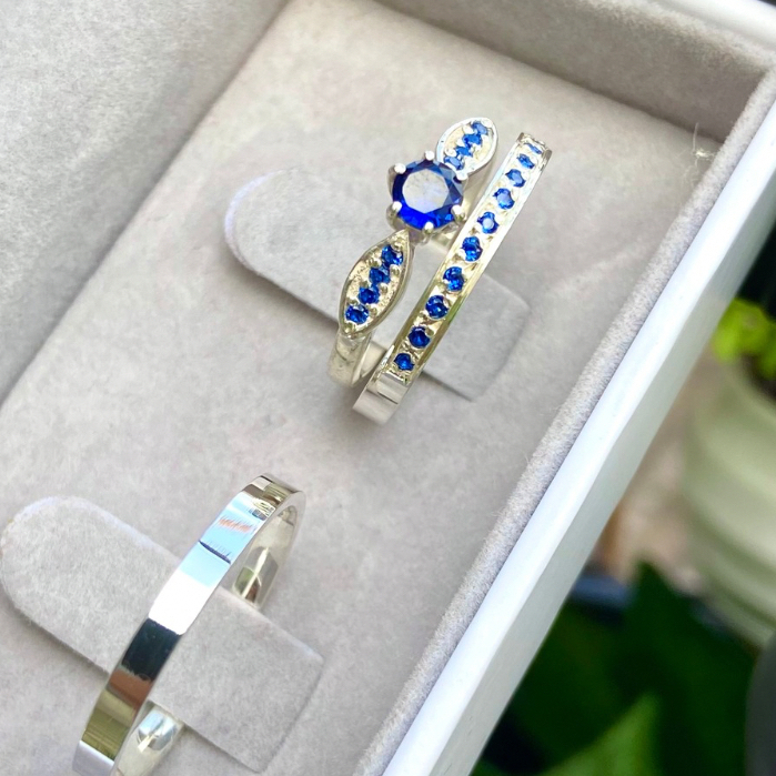 Par de Alianças de Namoro Prata 950 2mm com Fileira de Pedras Azuis + Anel Solitário Personalizado
