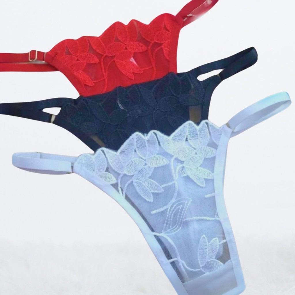 KIT 3 Calcinhas Tanga Tule Bordado Fio Duplo com Regulagem Luxo Lingerie Feminina