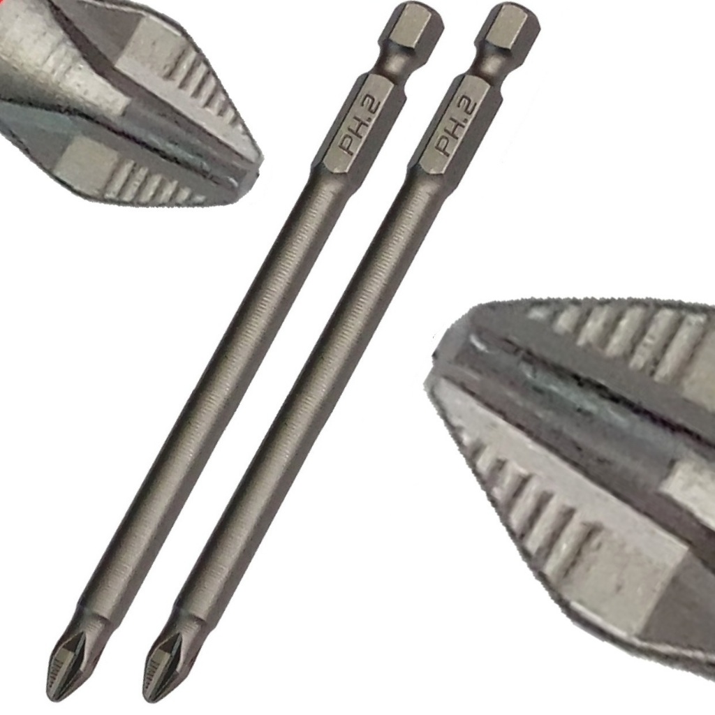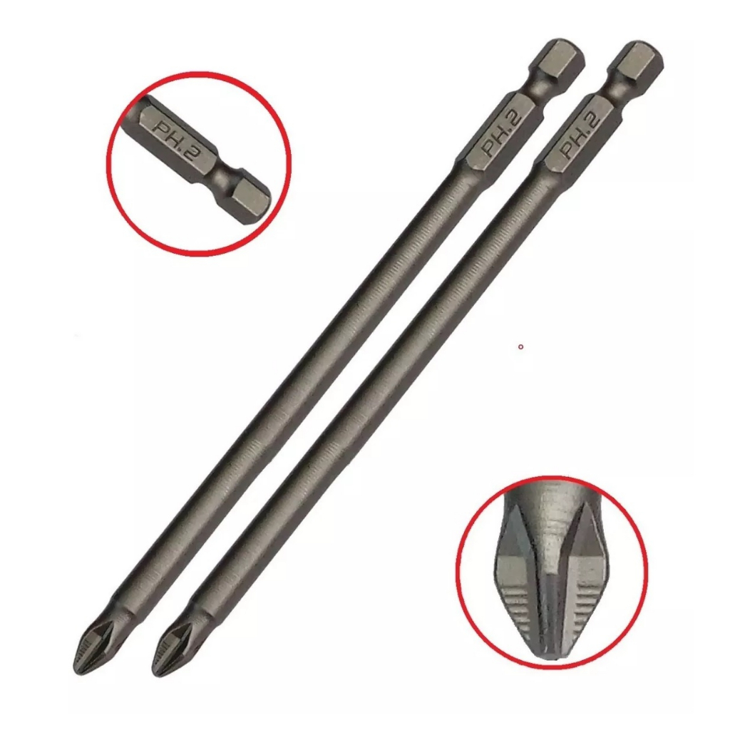 2 Pontas Bits Phillips Extra Longo Uso Profissional Ph2 127mm com imã e ranhuras antiderrapantes