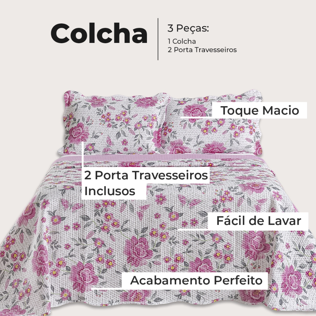 Kit Cobre Leito Colcha Queen Bouti 3 Peças Dupla Face Estampada Porta Travesseiro Aba Americana